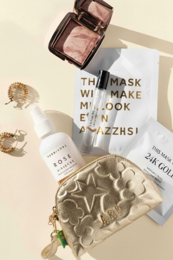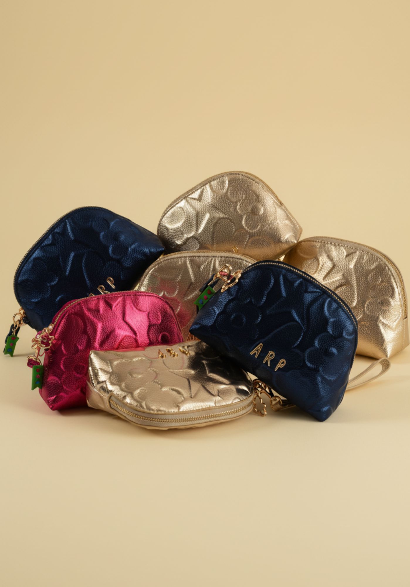 Este neceser ovalado de Agatha Ruiz de la Prada está diseñado en piel sintética metalizada, con un acabado elegante y luminoso que aporta un toque sofisticado. El material incorpora los iconos de la marca grabados en relieve, creando un efecto visual con volumen que eleva el diseño y lo hace muy especial.