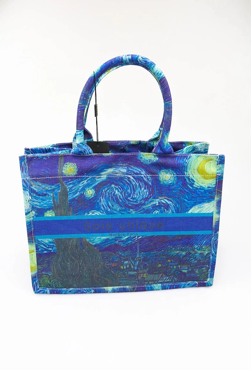 Bolso Mediano con Impresión de «La noche estrellada» de Vicent Van Gogh perteneciente a la colección de prendas relativas al arte de Paniculatta Una pieza que fusiona arte y funcionalidad, convirtiéndose en un accesorio que transmite pasión, elegancia y estilo.»Una pieza que fusiona arte y funcionalidad. Ideal para amantes del arte, mujeres creativas y espíritus románticos que buscan destacar con un toque único.Dimensiones: 36,5 × 28 × 17,5 cm
