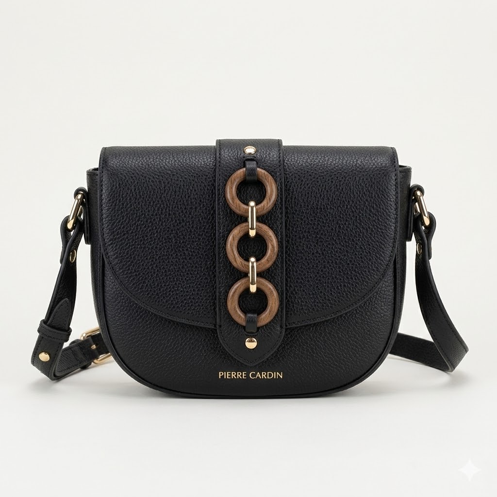 Bolso bandolera de la firma Pierre Cardin, confeccionado en ecopiel de acabado mate con estructura firme y diseño compacto. Su silueta redondeada se enriquece con una cadena decorativa en el frontal, compuesta por eslabones metálicos entrelazados que aportan carácter, ritmo visual y un gesto de sofisticación urbana. Incluye una correa ajustable para llevar al hombro o cruzado, y una práctica bolsa interior que permite organizar lo esencial con discreción.