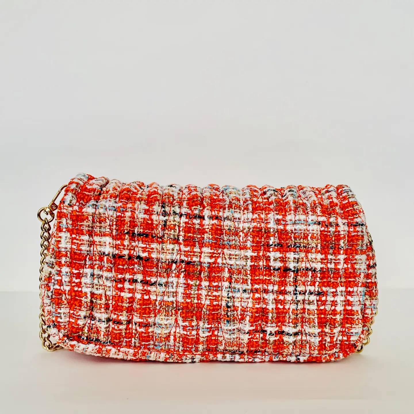 Bolso de mano en tejido texturizado tipo tweed con estampado de cuadros en rojo, blanco y negro, evocando la estética clásica de los inviernos europeos y la calidez de los tejidos tradicionales. Su diseño estructurado se enriquece con letras doradas dispersas sobre la superficie, creando un juego visual lúdico y contemporáneo que transforma el bolso en objeto narrativo. El cierre frontal en forma de chevrón metálico dorado y la cadena decorativa aportan un toque sofisticado, mientras que el asa de cadena con detalle en piel roja refuerza la armonía cromática y la funcionalidad.