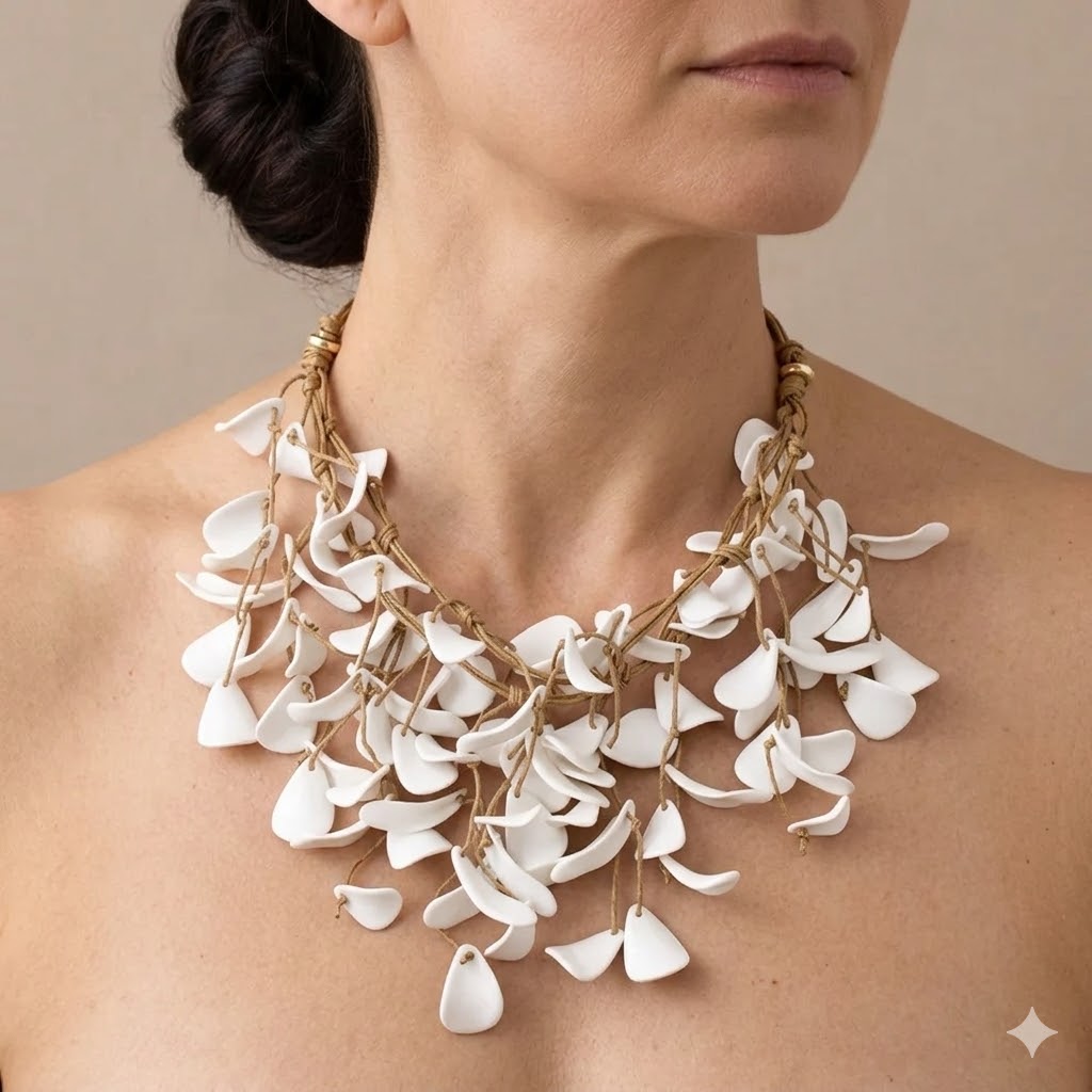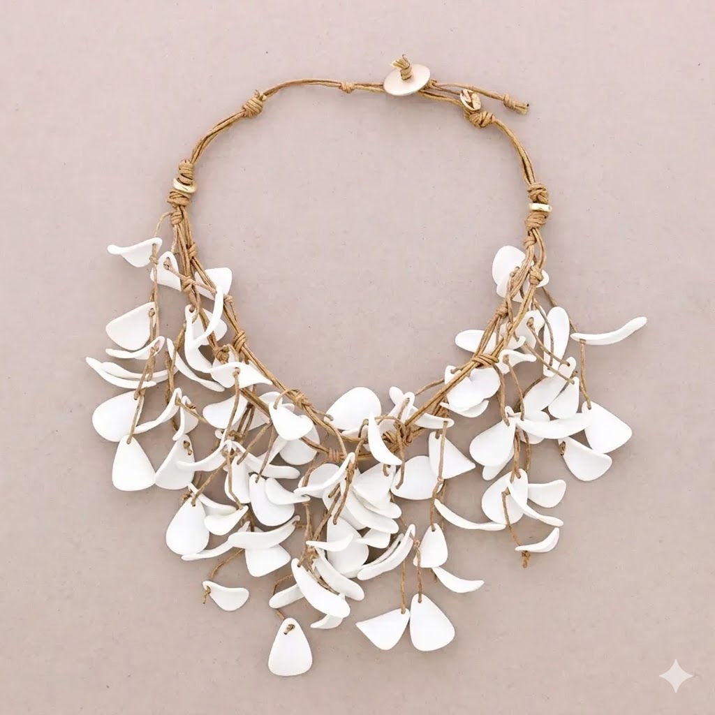 Esta gargantilla destaca por su estética orgánica y su aire artesanal. Está elaborada con múltiples cordones en tono arena, anudados a mano para crear una base cálida y natural. De ellos cuelgan numerosos pétalos de resina en color blanco, cada uno con forma irregular que imita pequeñas piezas cerámicas o fragmentos marinos.
