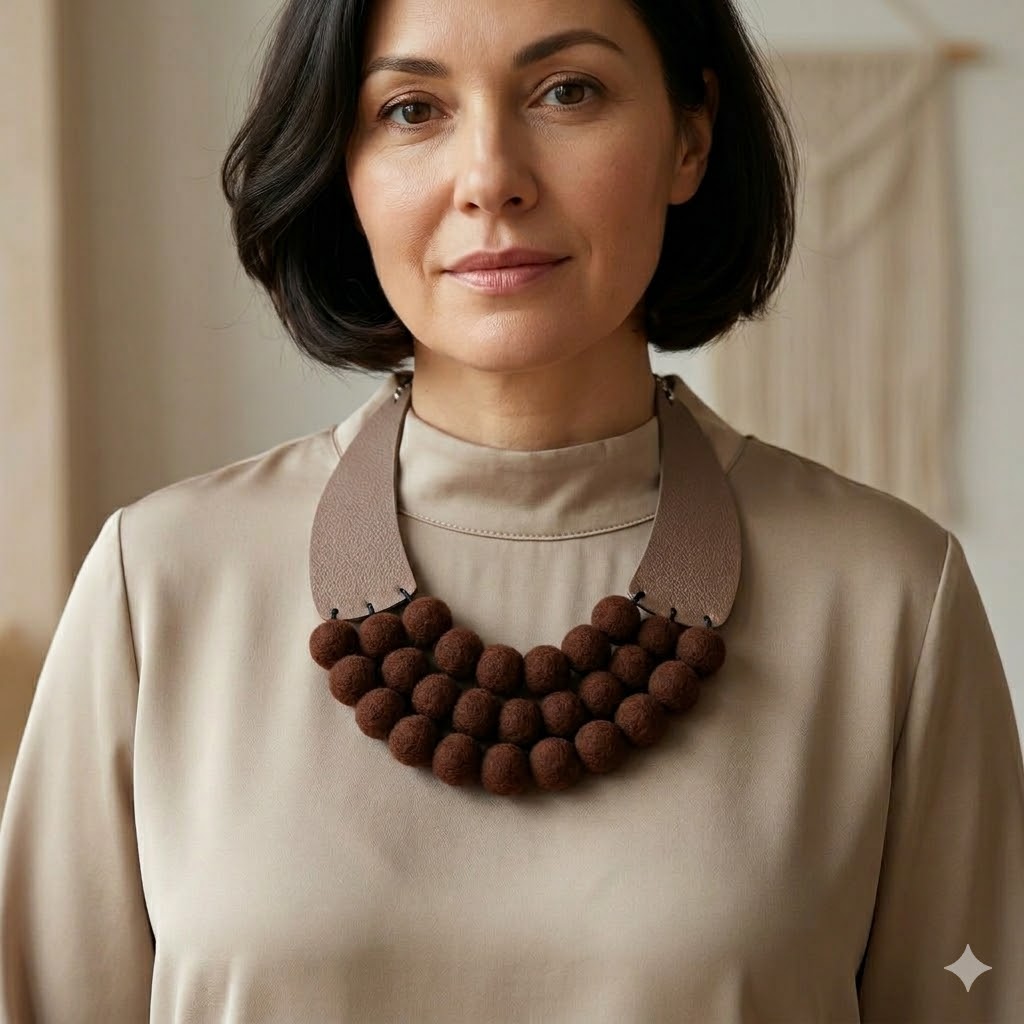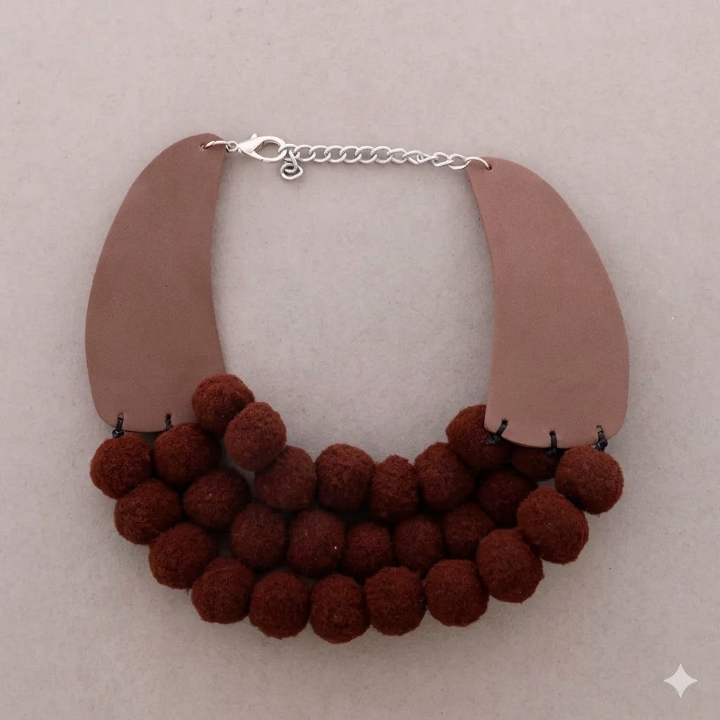 Esta gargantilla destaca por su diseño atrevido y contemporáneo, combinando materiales suaves y estructurados para crear una pieza con mucha personalidad. Presenta tres filas de pompones textiles en tono marrón oscuro, dispuestos de forma densa y equilibrada, que aportan volumen, textura y un movimiento muy elegante al llevarla puesta.