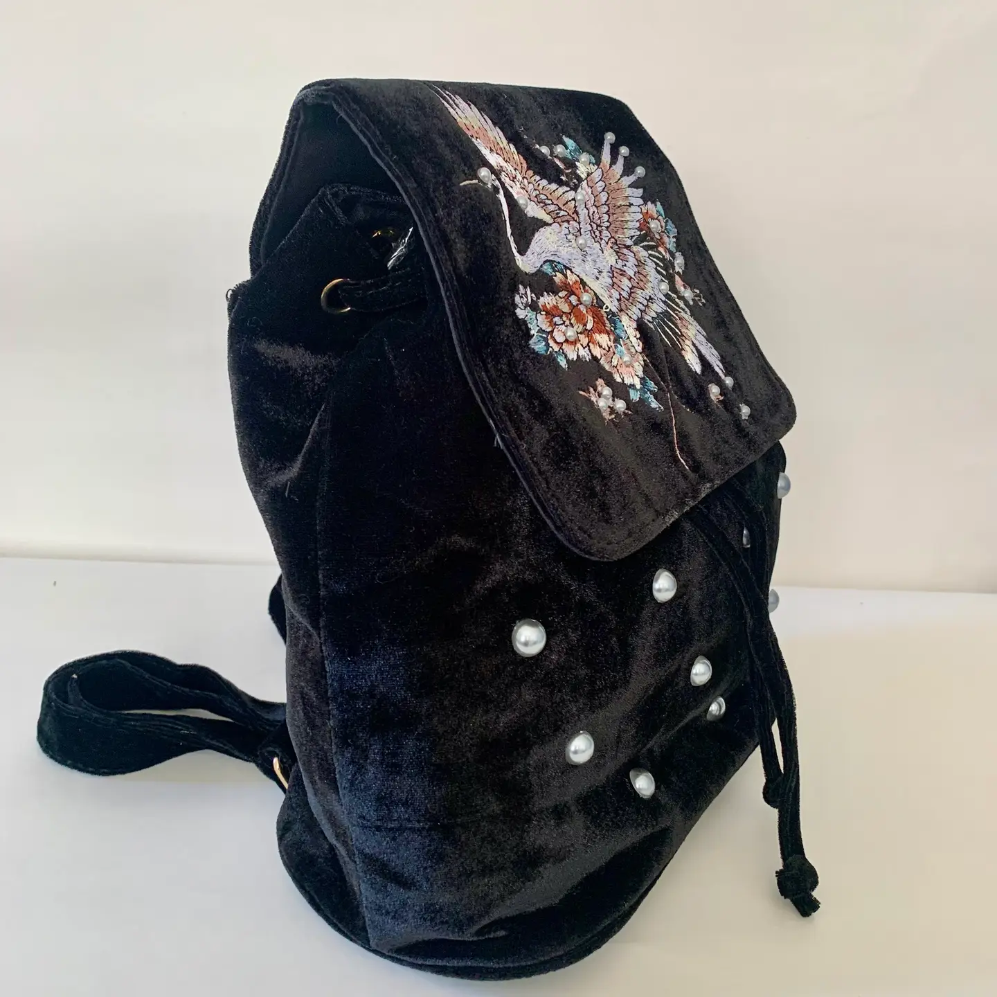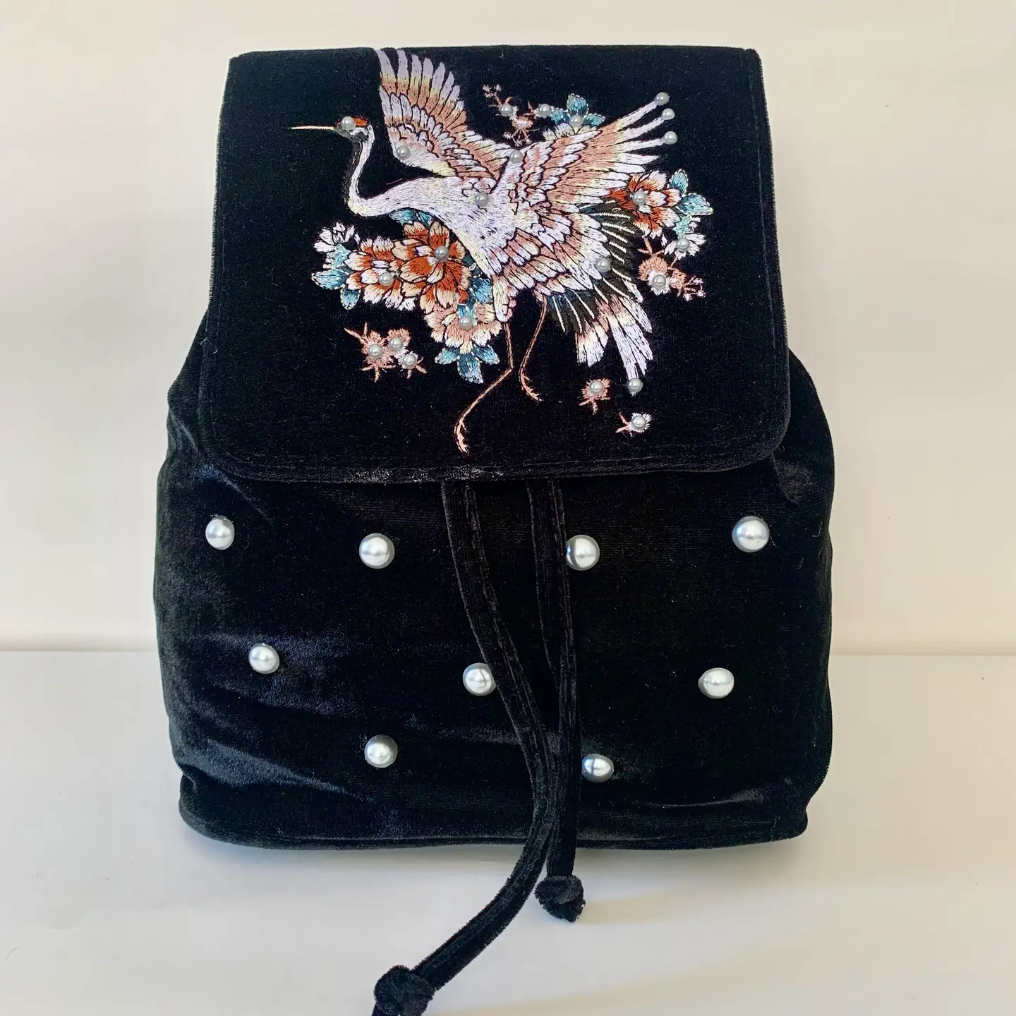 Mochila de terciopelo negro con textura suave y acabado mate, diseñada con estructura ligera y cierre de cordón ajustable bajo solapa bordada. En el centro de la solapa, una grulla bordada en vuelo se rodea de flores en tonos rojos, azules y blancos, evocando escenas de jardín oriental y simbolismo ancestral. El cuerpo de la mochila se adorna con perlas distribuidas de forma regular, aportando luz y ritmo visual a la superficie oscura.