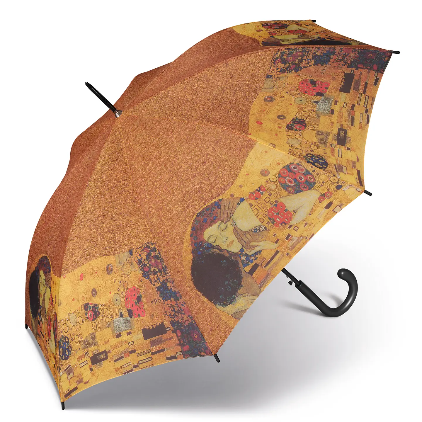 Un paraguas de Arte con el Beso de Gustav Klimt en su tejido, probablemente la obra más conocida de este pintor austríaco. Este modelo está disponible en montura plegable manual.