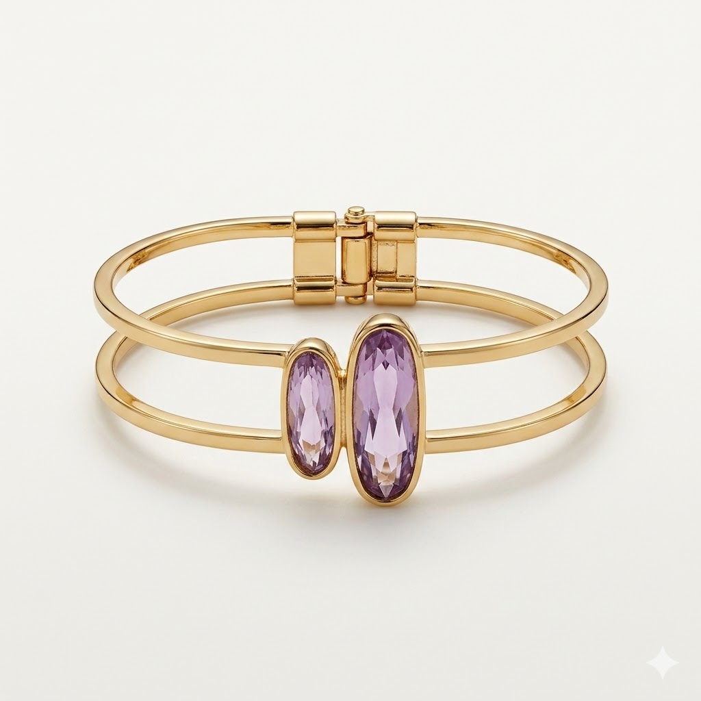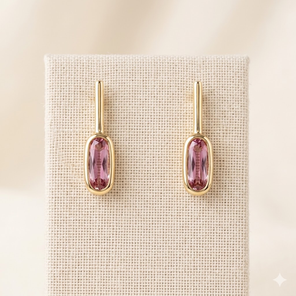 Estos pendientes destacan por su diseño minimalista y sofisticado, combinando una fina barra dorada con una gema amatista alargada que aporta un toque de color suave y luminoso. La piedra, facetada y enmarcada en un bisel dorado, refleja la luz con sutileza, creando un efecto elegante y muy femenino.