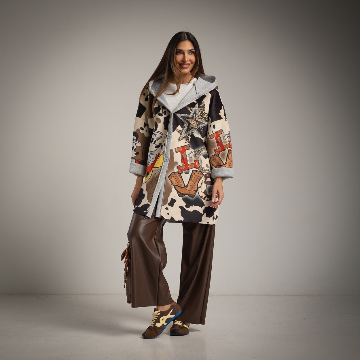 Una pieza que mezcla nostalgia, humor y carácter. Este abrigo oversize con capucha es un homenaje a la cultura pop y al espíritu libre, pensado para mujeres que se atreven a contar su historia con estilo.