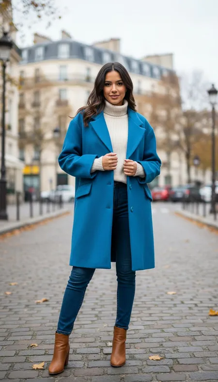 Abrigo oversize de media longitud en azul vibrante, confeccionado en tejido estructurado con caída fluida y tacto suave. Su silueta amplia y recta aporta comodidad sin renunciar a la presencia, mientras que el largo medio equilibra funcionalidad y estilo. El diseño incluye cuello clásico, cierre frontal oculto y bolsillos laterales discretos que refuerzan su estética depurada.