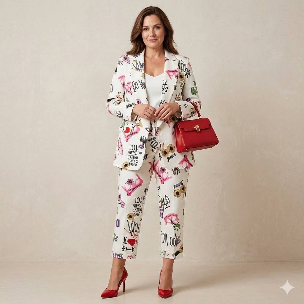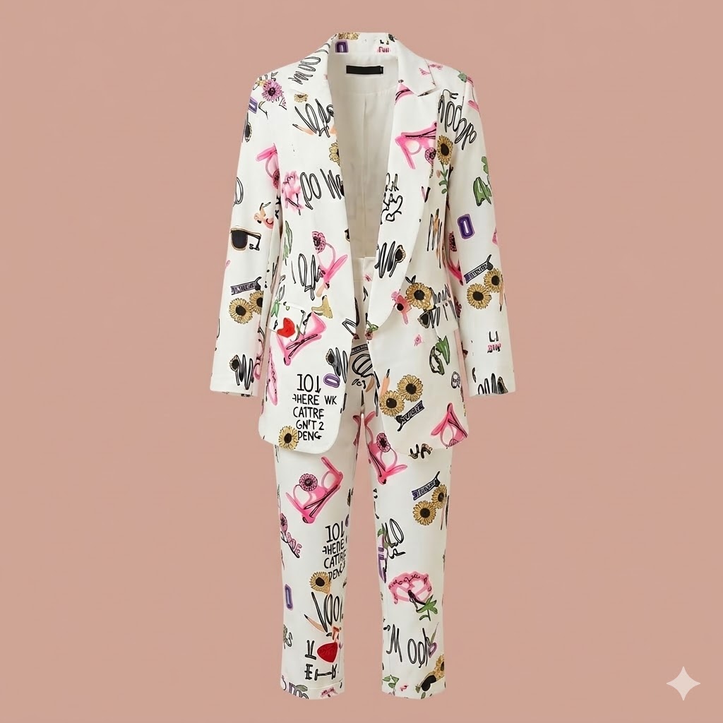 Este blazer es una pieza única que captura la esencia del street‑art parisino con un toque de alta moda. Confeccionado en un fondo blanco impecable, está intervenido con ilustraciones coloridas, tipografías creativas y motivos gráficos que evocan energía, libertad y expresión personal. Cada detalle —desde los ojos dibujados hasta las frases vibrantes como “JOY”, “HERE WE CAME” o “KATZ DEMO”— convierte la prenda en un lienzo lleno de personalidad.