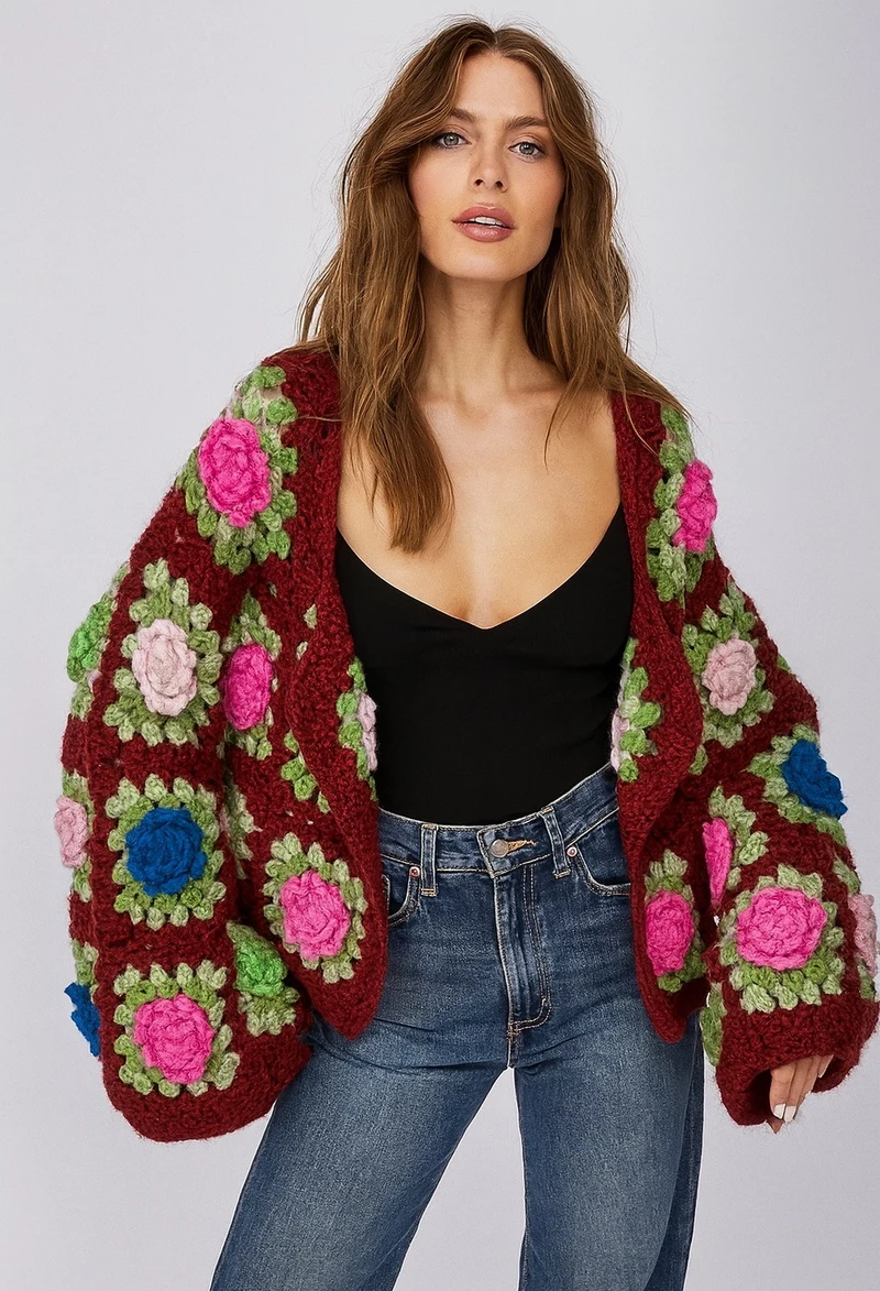 Cárdigan de Crochet Oversize – Tonos Azules Bohemios Una prenda que abraza el estilo libre y artístico. Este cárdigan extragrande de crochet, con patrones en tonos azules, es perfecto para crear un look bohemio, relajado y lleno de personalidad.Diseño oversize para un efecto envolvente y cómodo