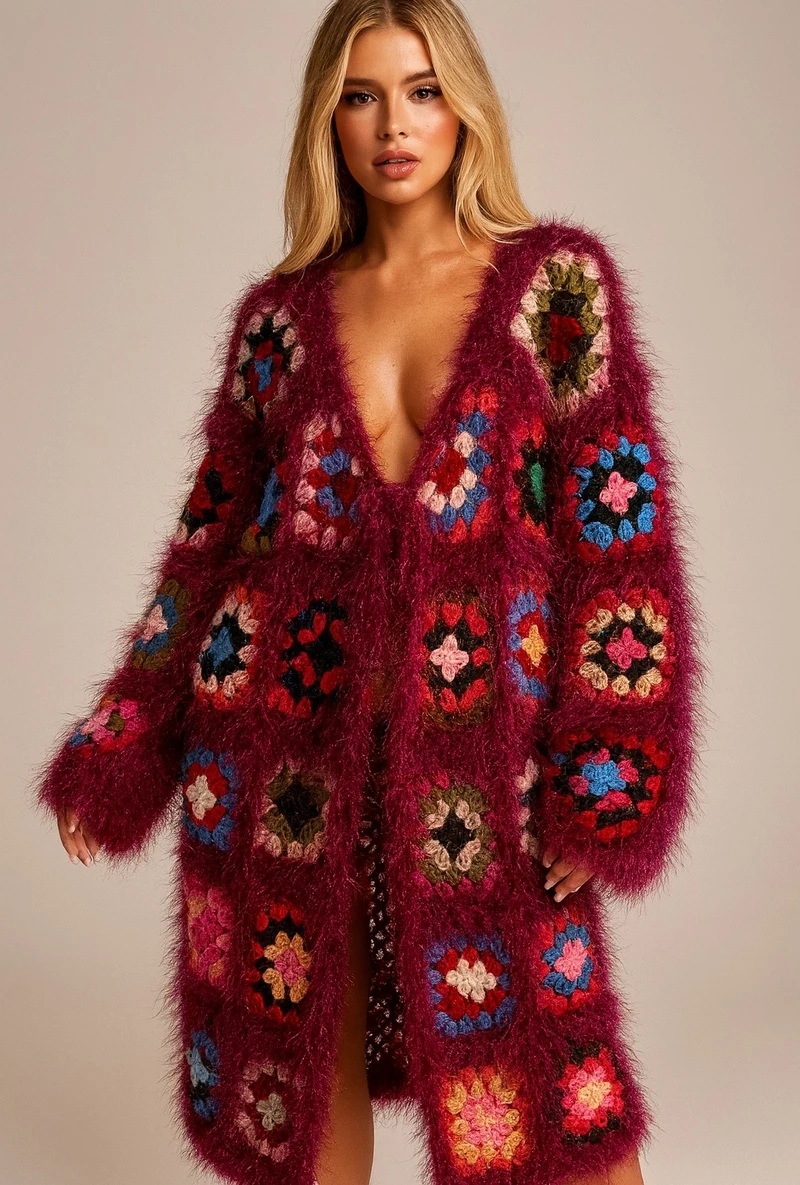 Cárdigan largo de punto crochet con hilos de lúrex en tono berenjena y motivos en rosa, fucsia y verde oliva. Diseño colorido y cálido pensado para aportar textura y presencia a los looks de otoño-invierno.