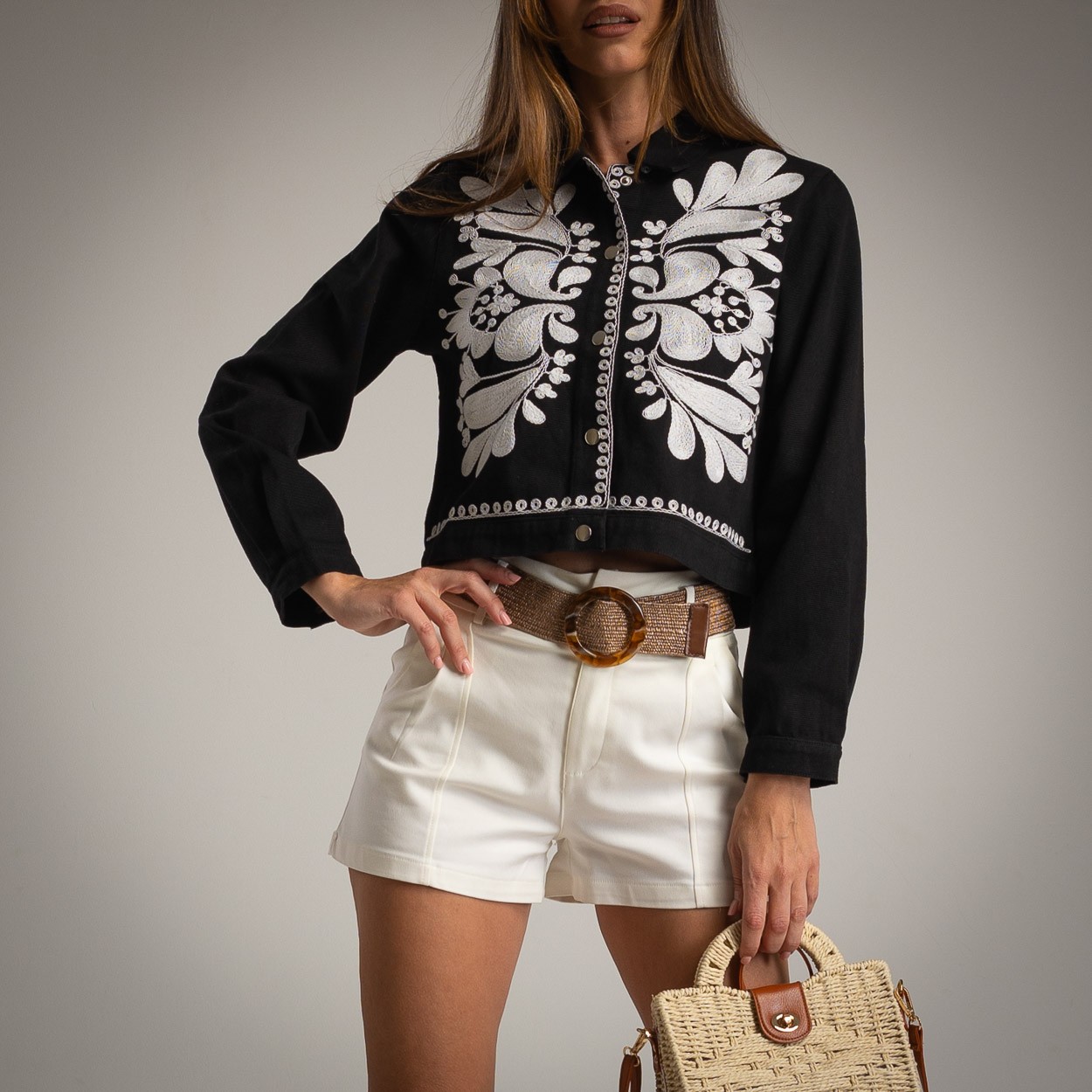 - Bordado floral en blanco en la parte frontal, creando un contraste elegante y llamativo.