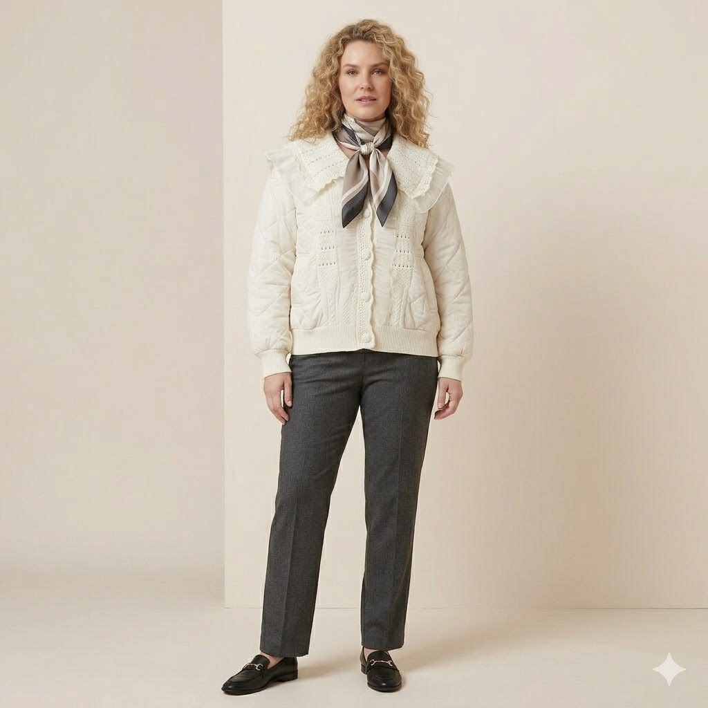Esta chaqueta lencera en tono crudo destaca por su estilo delicado y femenino, combinando un diseño acolchado con un acabado suave y ligero que aporta un aire romántico y sofisticado. Su cuello amplio con volantes añade un toque distintivo y muy actual, realzando la prenda con un encanto vintage irresistible.