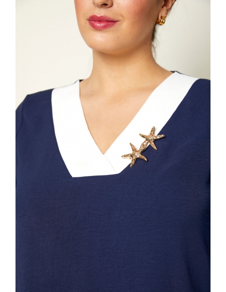 Este conjunto bicolor es una apuesta segura para lucir elegancia, comodidad y estilo en cualquier evento. Está formado por un blusón fluido con detalles en contraste y un broche removible que aporta un toque festivo y personalizable. El diseño combina líneas limpias con un punto sofisticado que realza la figura sin renunciar a la comodidad.
