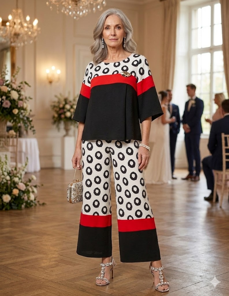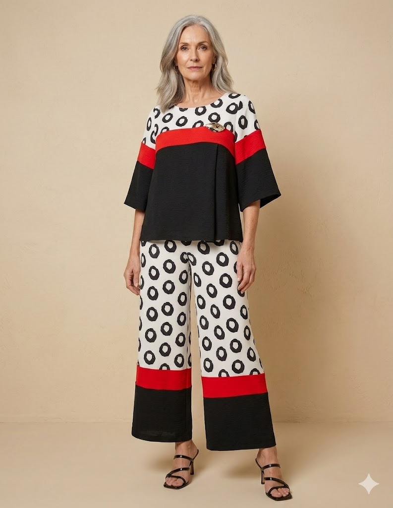 Conjunto de dos piezas confeccionado en un tejido ligero y fluido, con un estampado geométrico en blanco y negro realzado por bandas en rojo que aportan un toque sofisticado y muy actual. El top, de corte suelto y manga cómoda, ofrece una caída favorecedora que estiliza sin marcar. El pantalón, de pierna ancha, acompaña el movimiento con elegancia y proporciona máxima comodidad durante todo el evento.