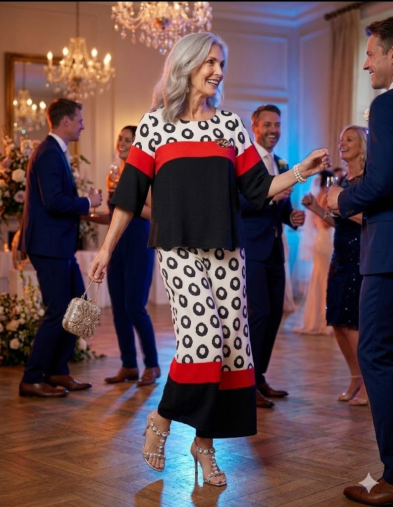 Un conjunto pensado para mujeres reales, ideal para celebraciones, bodas y ocasiones especiales donde se busca un look distinguido sin renunciar al confort. Los complementos metálicos y los tonos neutros combinan a la perfección con su diseño llamativo y equilibrado.