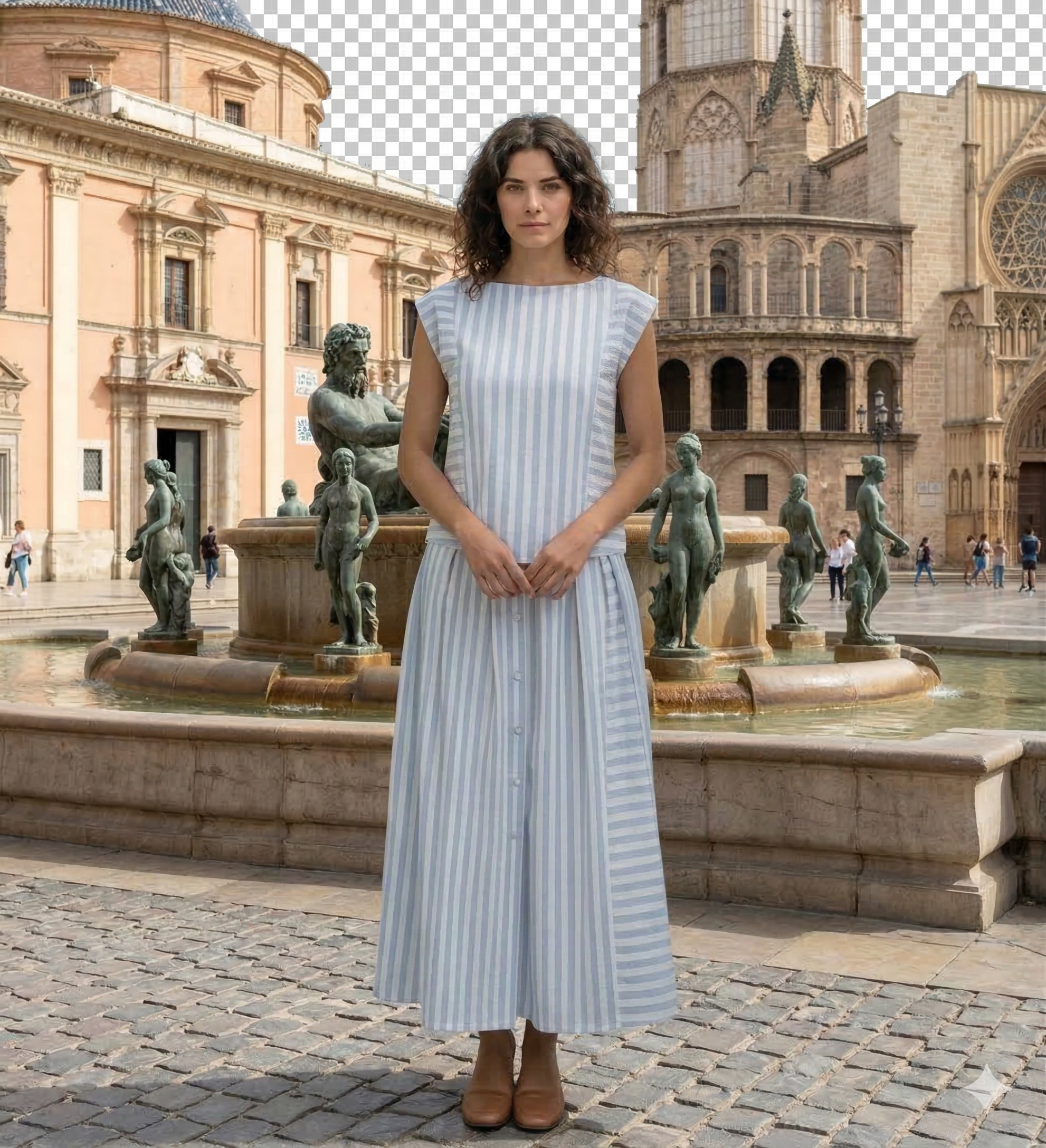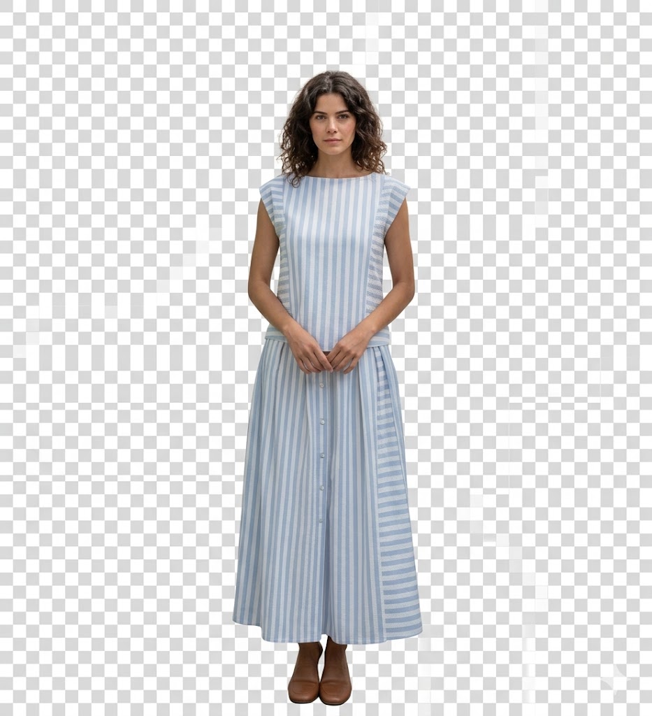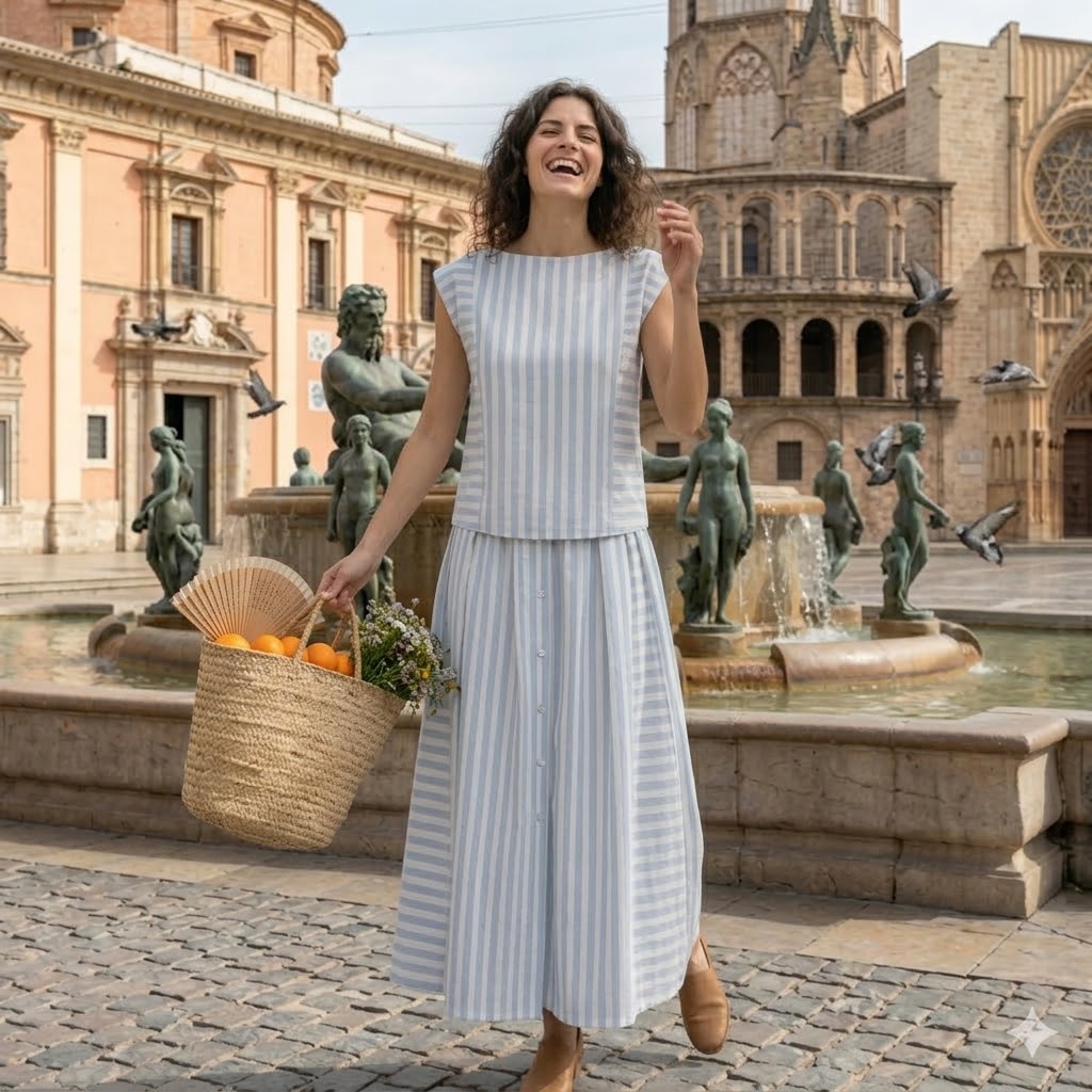 Este conjunto destaca por su estilo fresco, veraniego y muy favorecedor. Está formado por un vestido largo sin mangas con estampado de rayas verticales en tonos azul claro y blanco, un diseño que estiliza la figura y aporta una sensación de ligereza y movimiento.