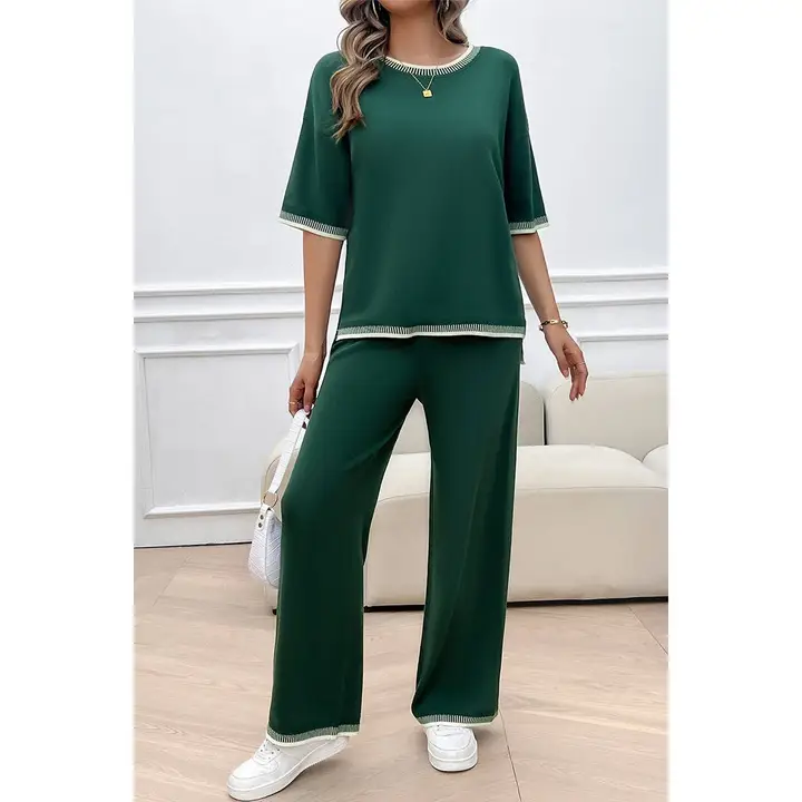 Este conjunto de punto en color verde destaca por su diseño moderno, cómodo y muy favorecedor para tallas grandes. La parte superior presenta un corte holgado con manga corta y detalles en contraste en el cuello, las mangas y el bajo, aportando un toque deportivo y actual. El pantalón, de pierna ancha y caída fluida, incorpora el mismo ribete en los bajos para un acabado coordinado y elegante. Su tejido suave y flexible garantiza confort durante todo el día, convirtiéndolo en un conjunto ideal para looks casuales con estilo.