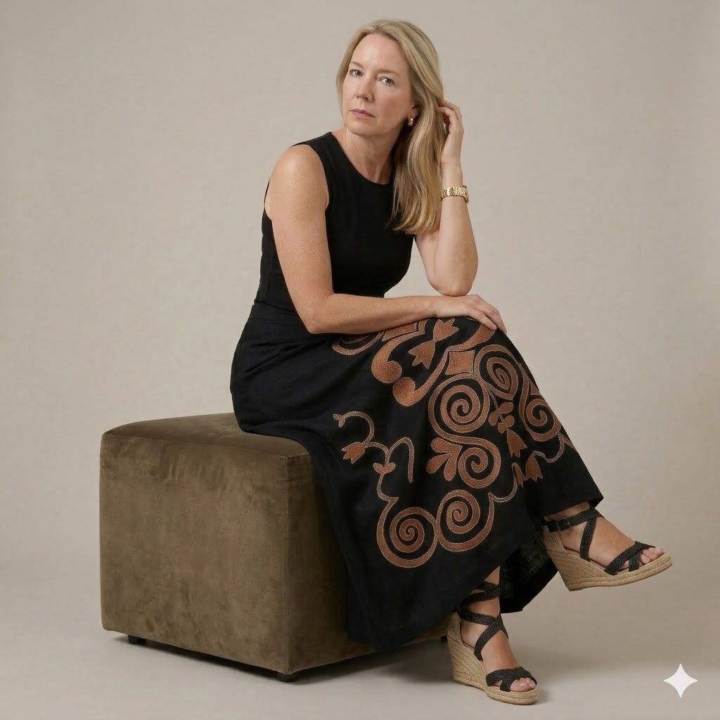 La Falda Arabesque destaca por su estilo sofisticado y artístico, combinando la elegancia del negro con un diseño ornamental en tonos marrones que aporta personalidad y distinción. Su corte largo y fluido crea una silueta estilizada y muy favorecedora, ideal para looks tanto casuales como más arreglados.