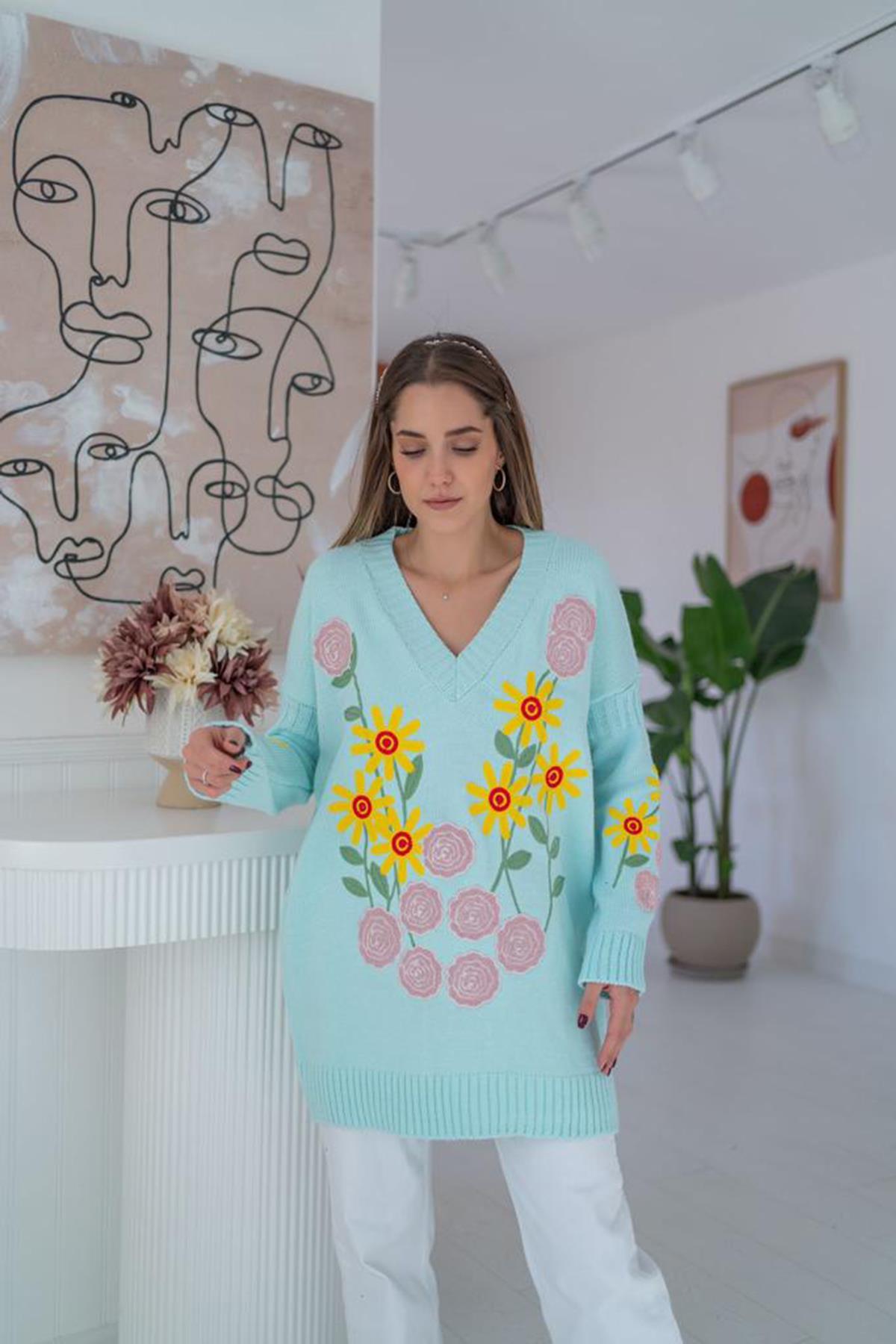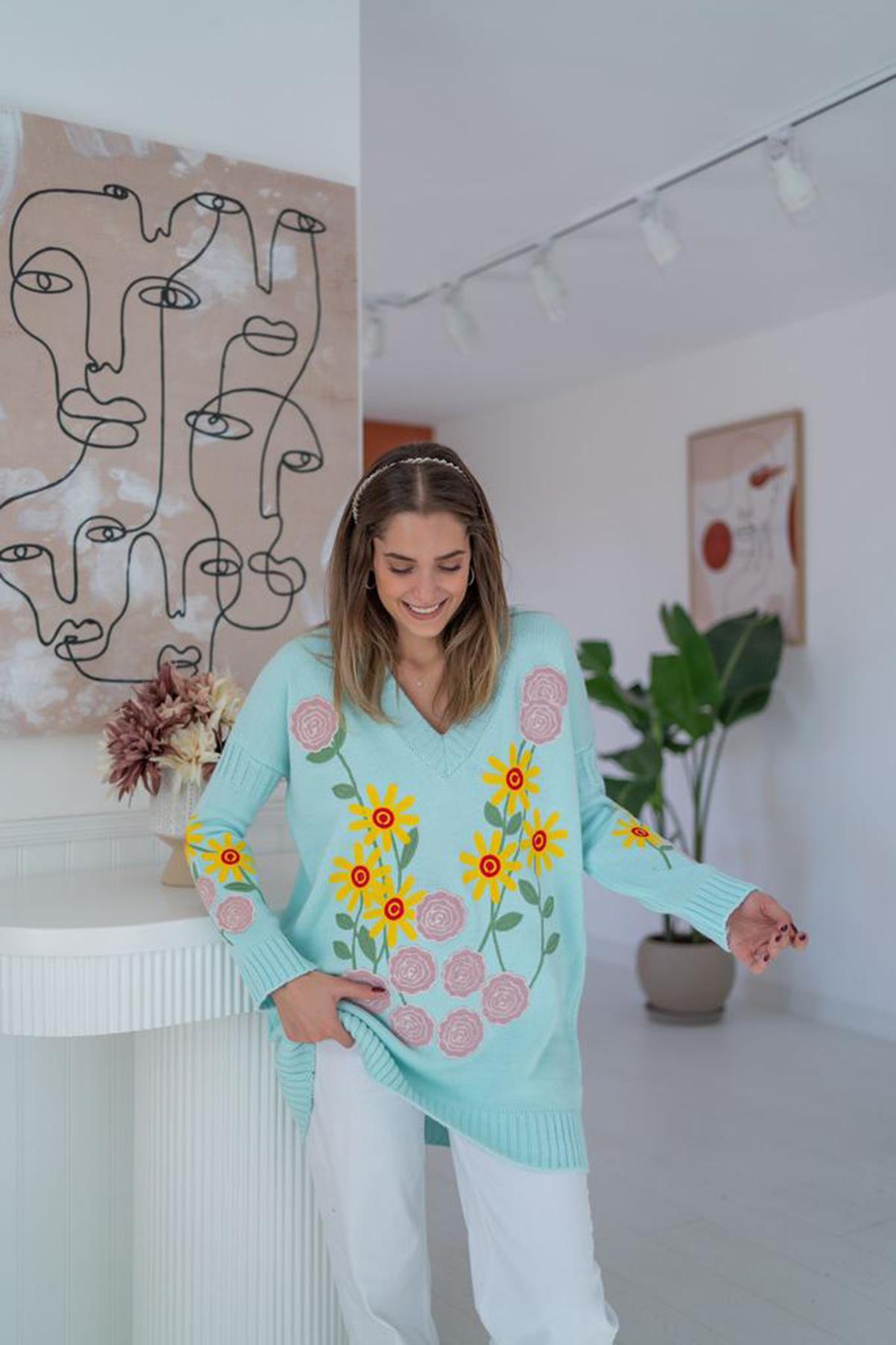 Un diseño que combina suavidad, color y encanto artesanal. Este suéter azul de algodón destaca por su bordado de flores, delicado y lleno de vida, ideal para mujeres que buscan estilo sin renunciar a la comodidad.