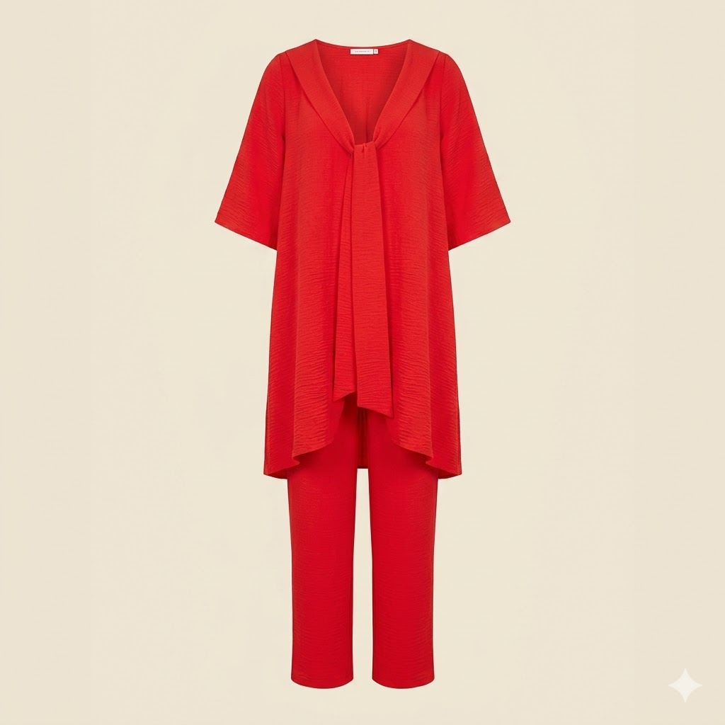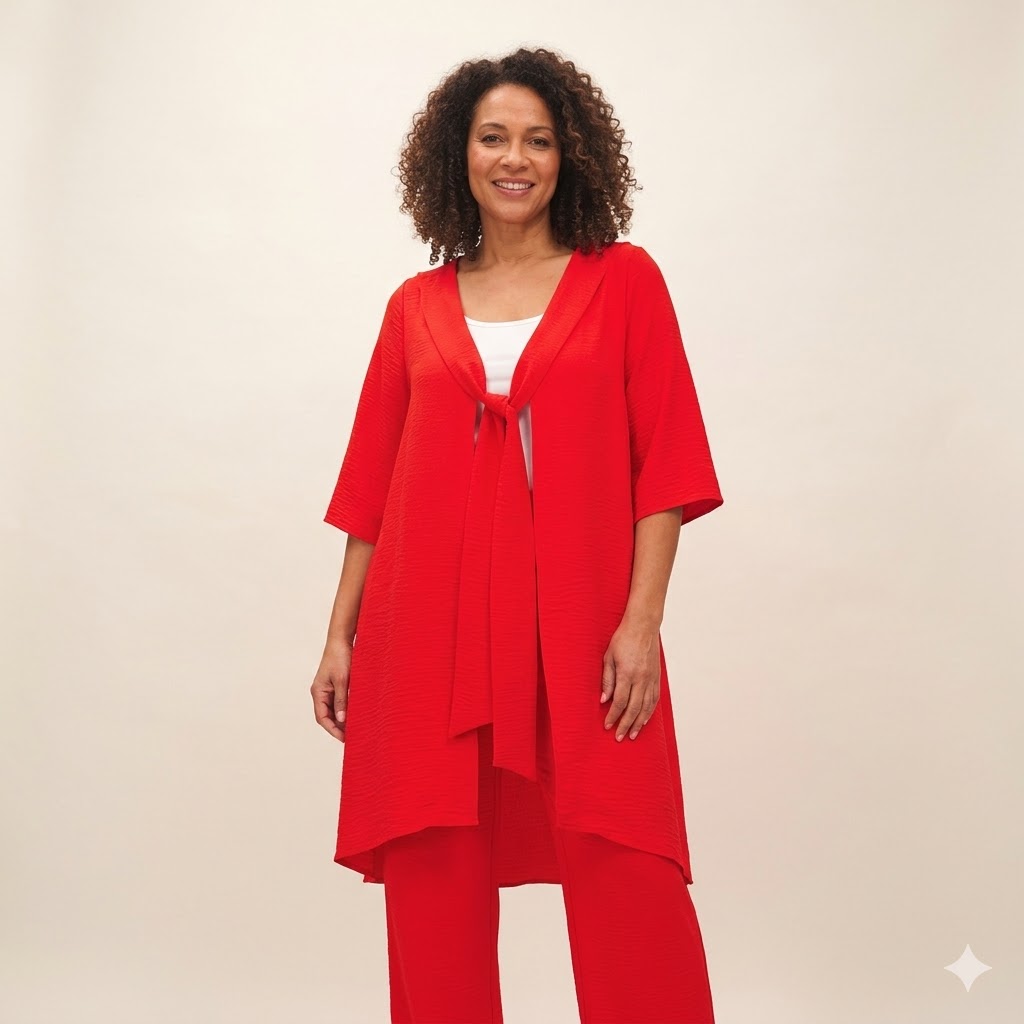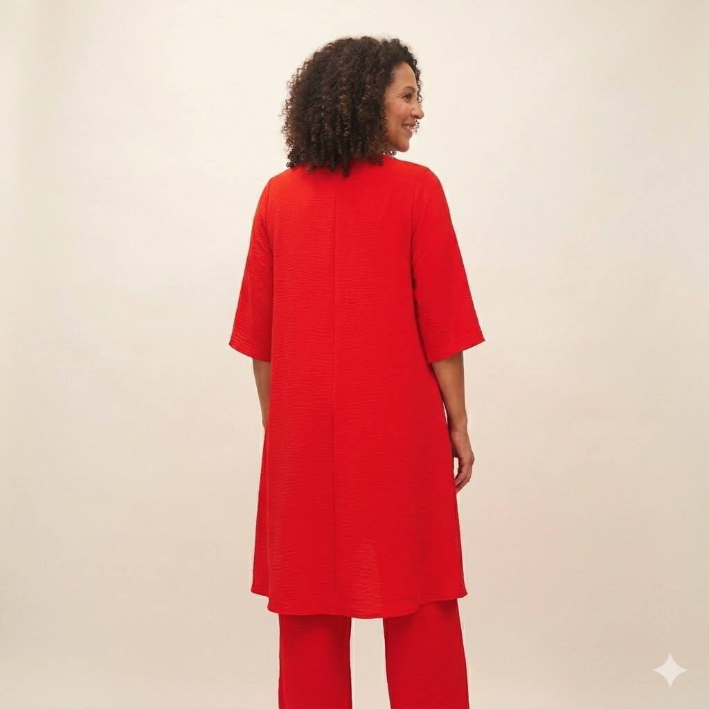 Levita lisa confeccionada en tejido tipo crepé, con un corte amplio que aporta movimiento y comodidad. Su cierre de lazada o drapeado permite ajustar la prenda de forma favorecedora, mientras que la manga 3/4 añade un toque sofisticado y actual.