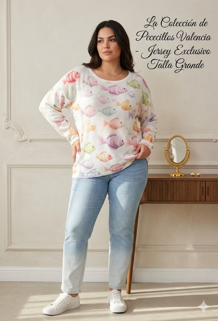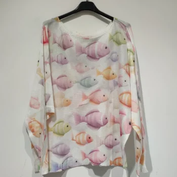 El suéter está confeccionado en un tejido ligero, perfecto para entretiempo o para llevar bajo chaquetas sin aportar volumen. Su base clara sirve como fondo para un estampado de pececillos multicolor, distribuidos de forma armoniosa y con un estilo casi ilustrado que transmite frescura y dinamismo. El corte es cómodo y relajado, pensado para tallas grandes sin perder estilo.