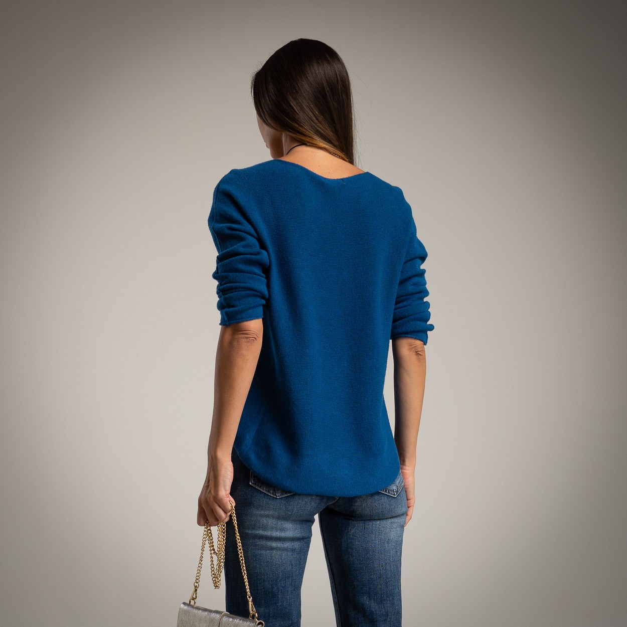 El suéter presenta un tono azul profundo muy favorecedor, perfecto para combinar tanto con tonos neutros como con colores más vivos. Su escote en V estiliza la figura y aporta un toque femenino sin perder comodidad. El tejido es fino pero con buena caída, ideal para llevar solo o bajo chaquetas y abrigos.
