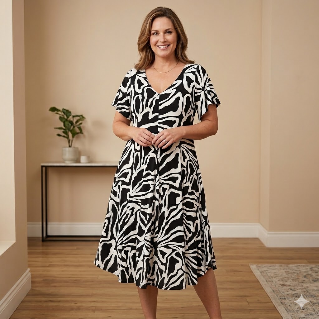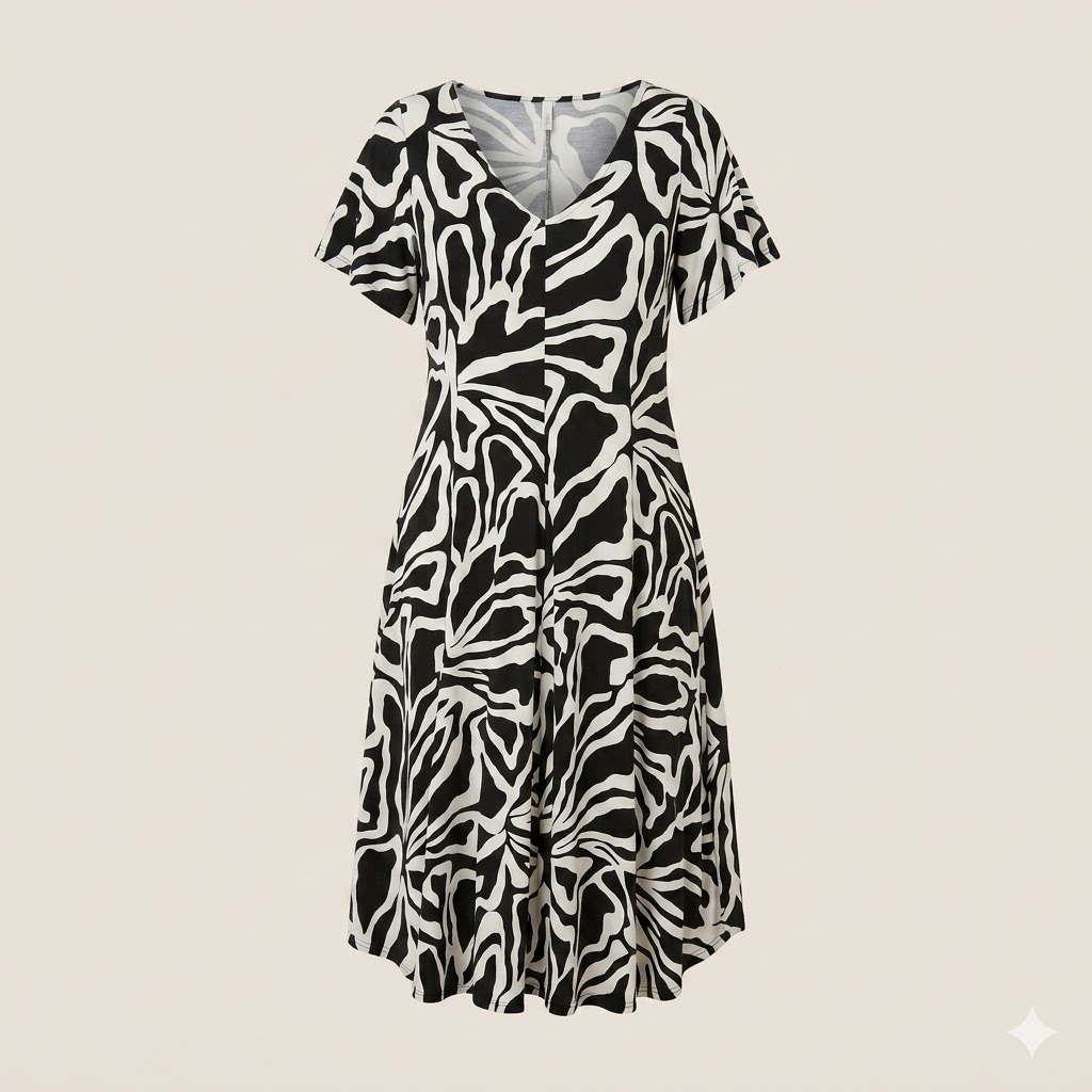 El estampado abstracto en blanco y negro aporta un toque moderno y elegante, ideal para quienes buscan un look versátil que funcione tanto de día como de noche. El escote en V y las mangas cortas completan un diseño fresco y fácil de combinar con sandalias, cuñas o incluso deportivas.