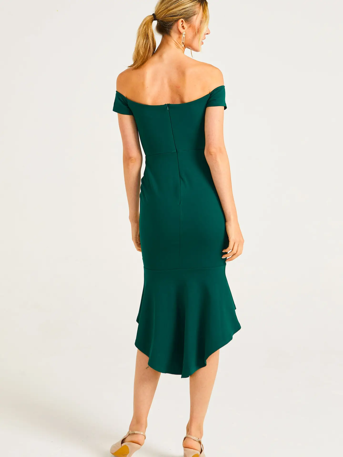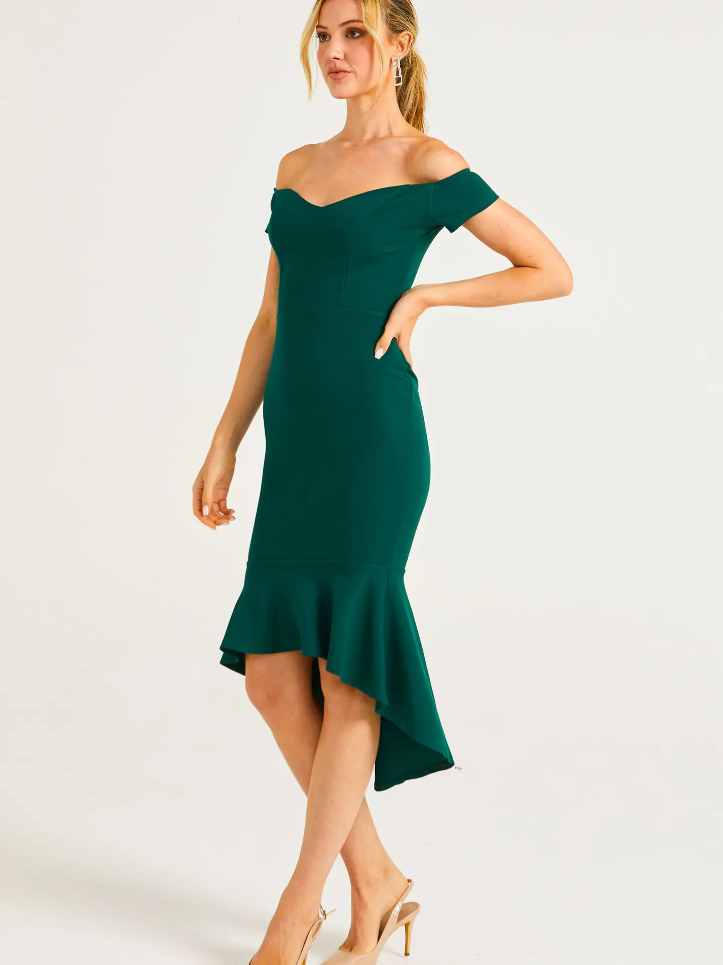 Vestido verde con escote Bardot, corte entallado y bajo asimétrico con volantes. Una pieza elegante y femenina, perfecta para realzar la silueta en cualquier evento especial.