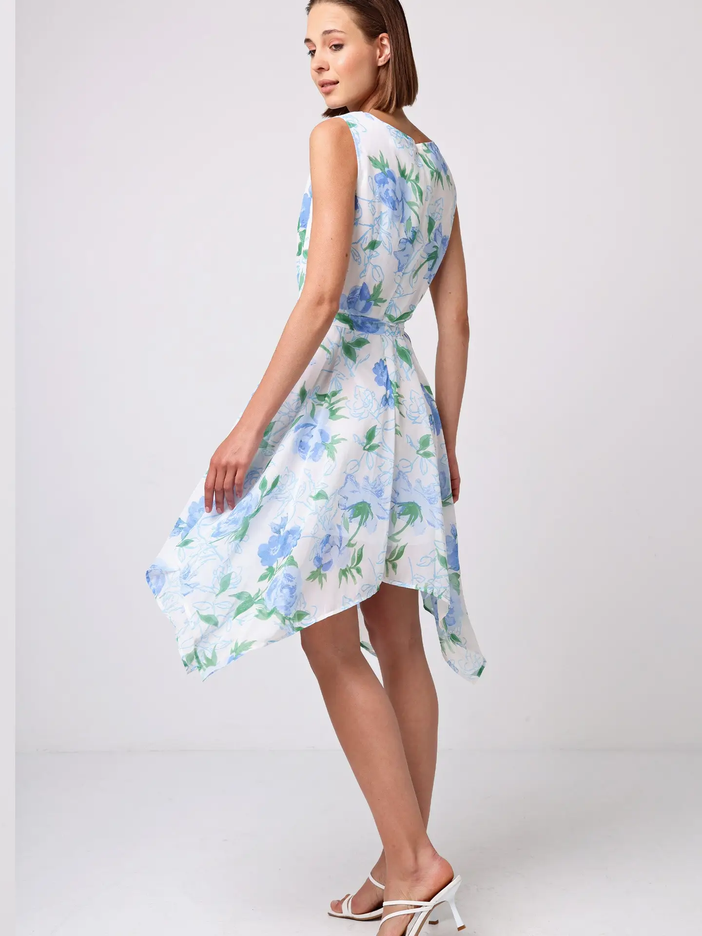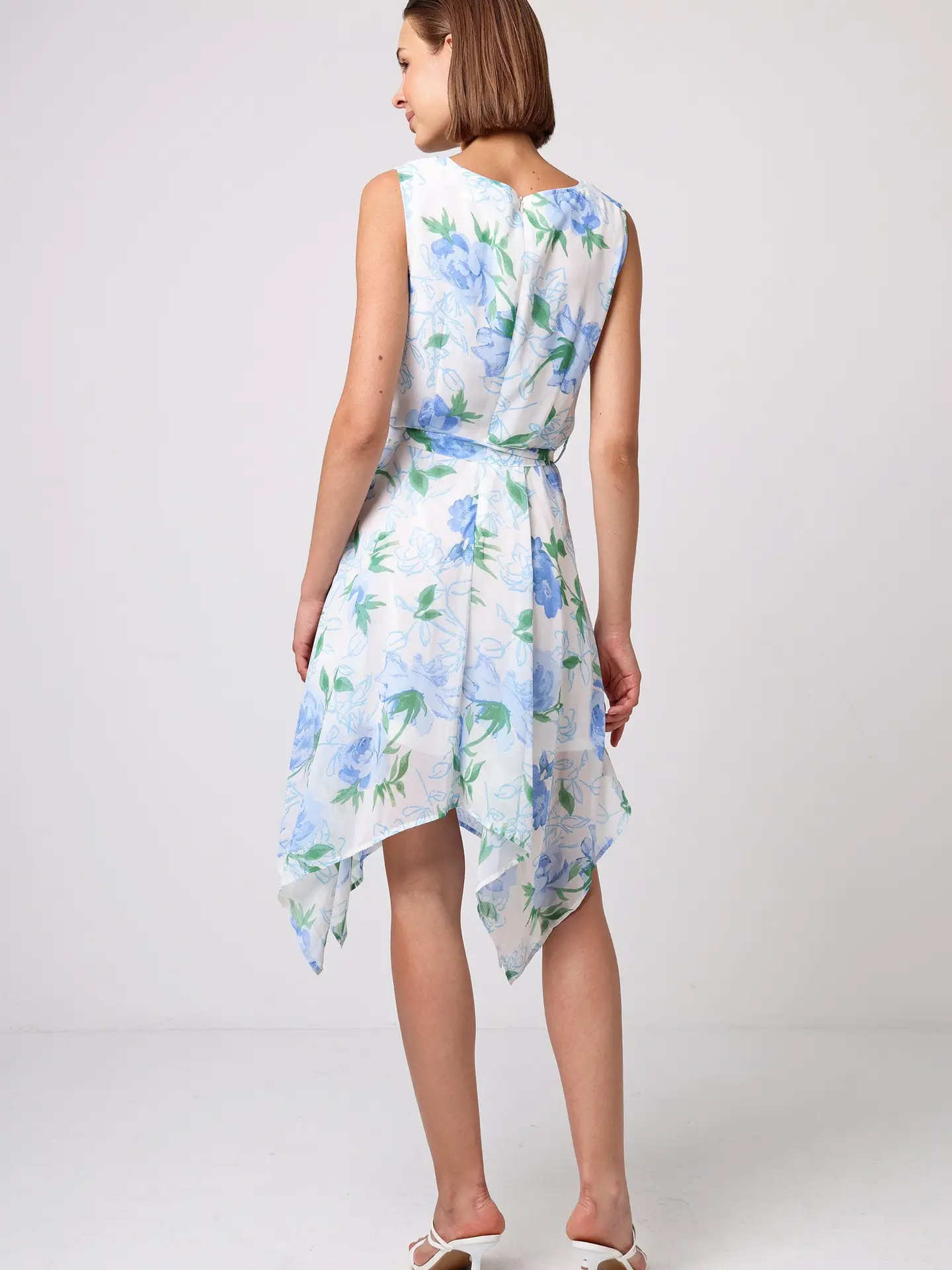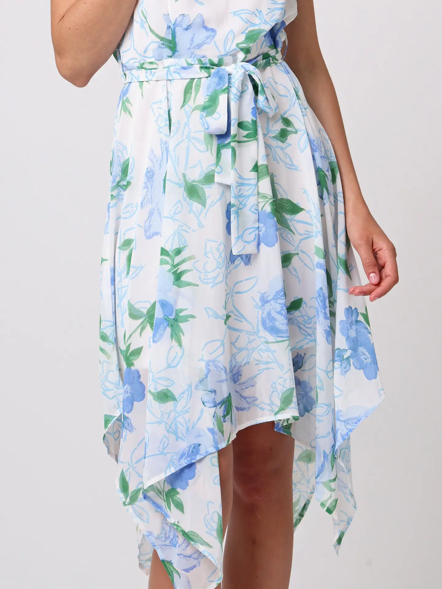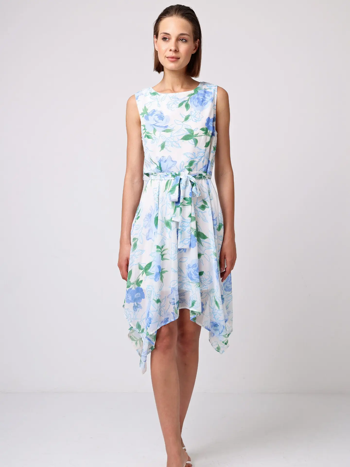 Impresiona con el vestido corto con cinturón de lazo y bajo asimétrico, decorado con delicadas flores azules sobre una base blanca. Su corte clásico se realza con la falda asimétrica que aporta movimiento y un toque moderno. El escote redondo modesto, el largo mini y la cintura elástica garantizan comodidad sin renunciar a un estilo coqueto y femenino.