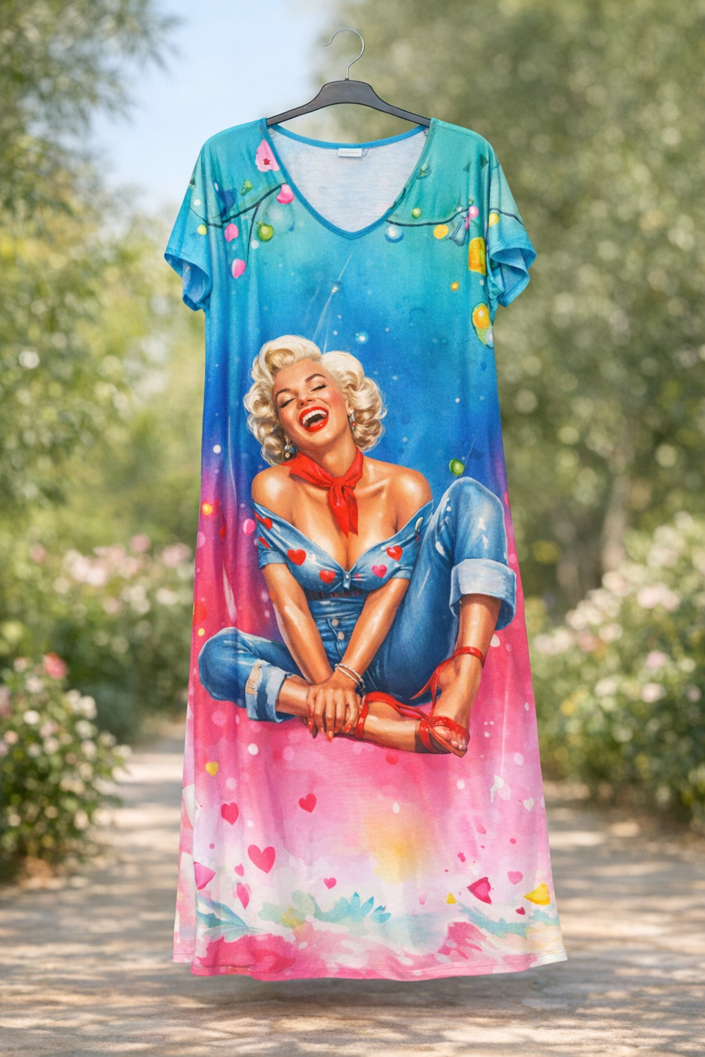 Este vestido largo es pura energía positiva. Con su estampado de Marilyn Monroe riendo a carcajadas, transmite libertad, color y ese toque rebelde que tanto nos gusta. El diseño combina tonos turquesa, rosa y coral en un degradado vibrante que ilumina cualquier día.