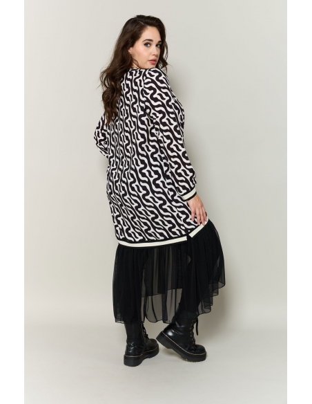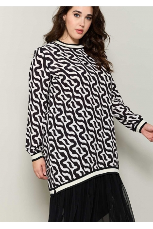 - Diseño: Parte superior estampada en blanco y negro con patrón ondulado, escote redondo con canalé a contraste y puños a juego. Silueta fluida que favorece sin ceñir.