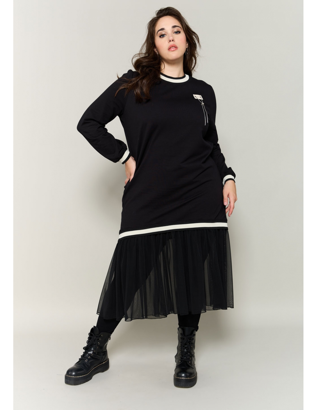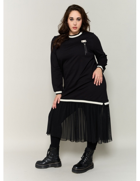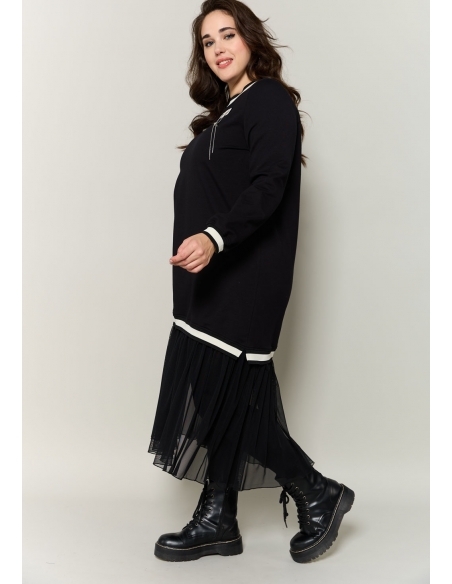 Vestido largo de manga larga en negro profundo, confeccionado en tejido estructurado con caída elegante. El diseño se articula en dos capas: una base opaca que abraza el cuerpo con sobriedad, y una sobreposición semitransparente plisada en la parte inferior que aporta movimiento, textura y un gesto de apertura. Los detalles en blanco —presentes en el cuello, los puños y el bajo— trazan líneas limpias que enmarcan la silueta y crean contraste visual. Un pequeño broche decorativo en el pecho añade un punto de luz y singularidad.