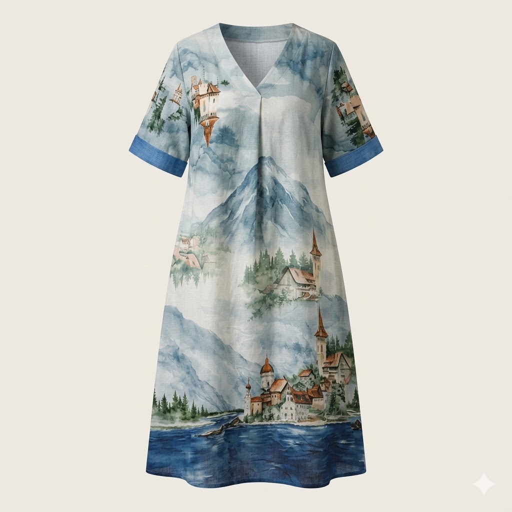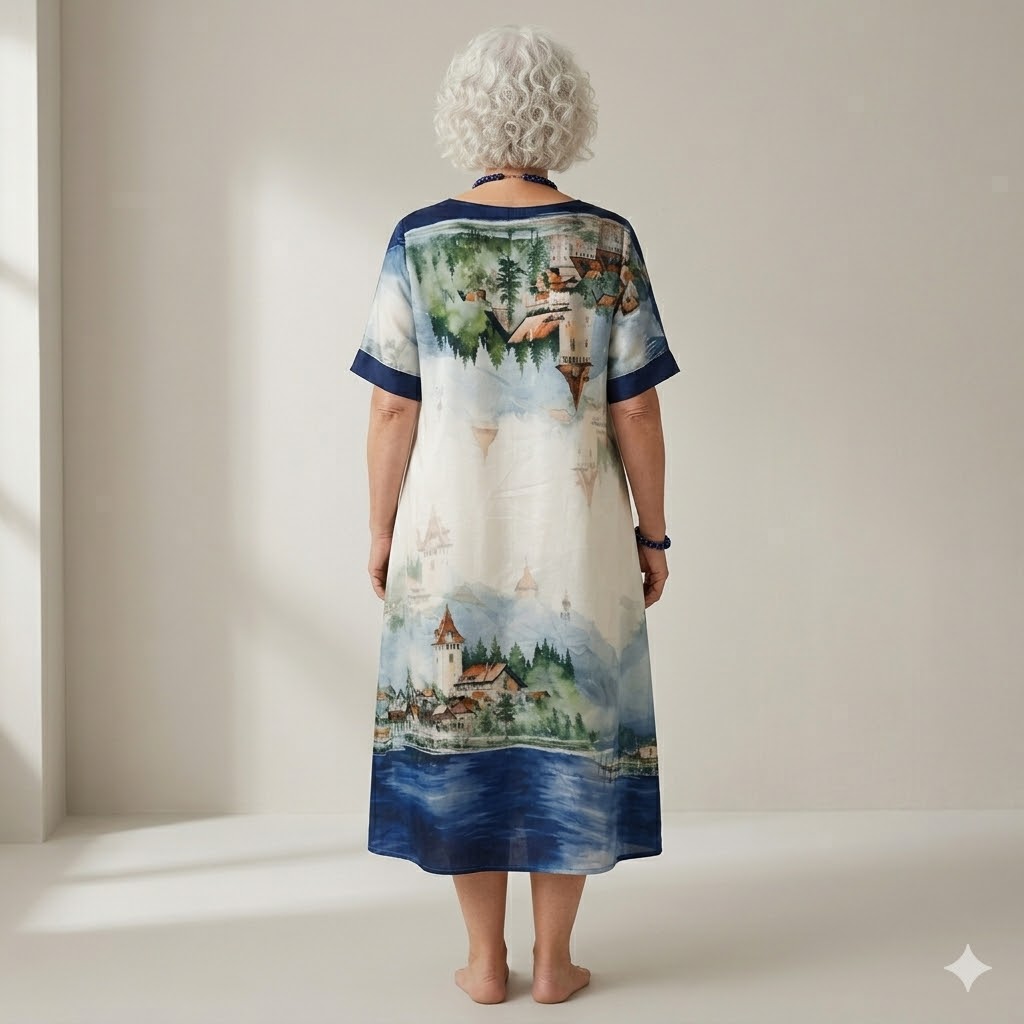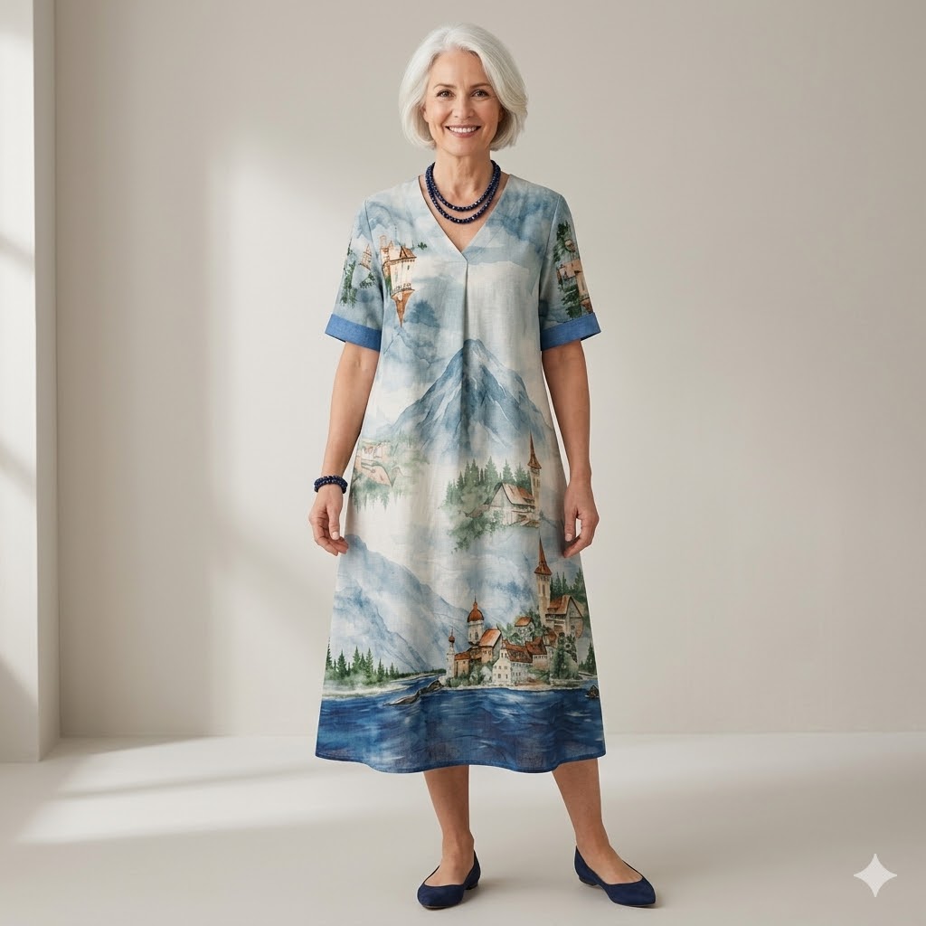 Vestido largo de corte amplio y cómodo, confeccionado en tejido ligero con estampado artístico de paisaje lacustre. El diseño muestra una escena pintada en tonos azules, verdes y beige, con montañas, árboles y un pequeño pueblo junto al lago, creando un efecto acuarela lleno de serenidad y elegancia. El escote en V y las mangas cortas con puños azul marino aportan contraste y estructura al conjunto, mientras que su caída fluida favorece todas las siluetas, especialmente en tallas curvy.