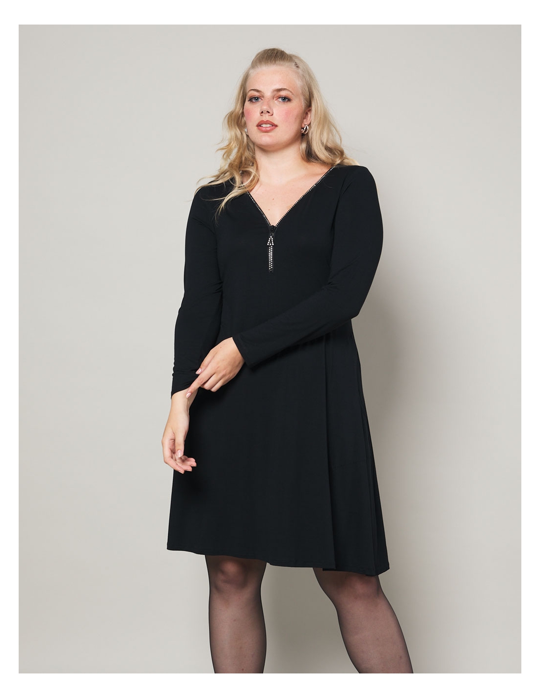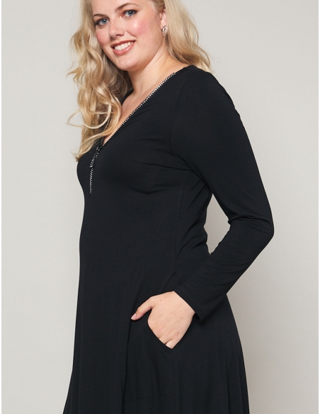 - Detalle especial: Escote en V con cremallera decorativa adornada con strass, que añade un brillo delicado y femenino.