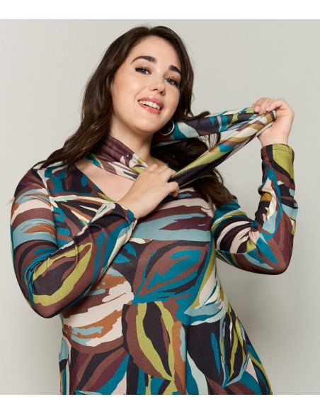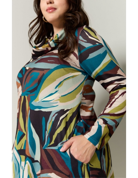 Vestido estampado evasé de manga larga en punto de lanilla con bolsillos. La pieza del cuello es de quita y pon para que puedas llevarlo como más te guste.Vestido de manga larga confeccionado en tejido suave y cálido, con estampado de hojas abstractas en tonos verde petróleo, marrón, burdeos, crema y verde oliva. Su diseño holgado y estructurado incluye cuello tipo drapeado y bolsillos laterales, ofreciendo comodidad sin renunciar al carácter. La silueta recta y el largo medio lo convierten en una prenda versátil, pensada para acompañar cuerpos reales con belleza y dignidad.