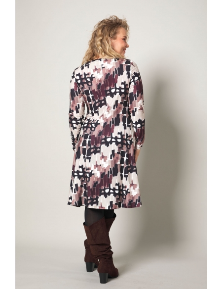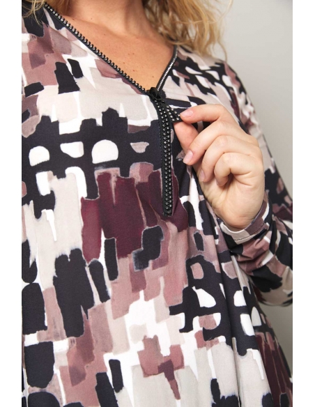 - Estampado: Motivo abstracto tipo pincelada en tonos malva, rosa, blanco y negro, que crea una composición dinámica y envolvente.