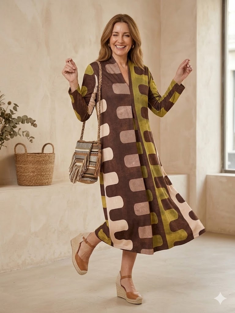Este vestido midi está confeccionado en lycra fría, un tejido ligero, suave y de caída fluida que aporta comodidad durante todo el día. Su diseño destaca por un estampado geométrico retro en tonos tierra, verdes y beige, creando un look moderno con esencia bohemia.