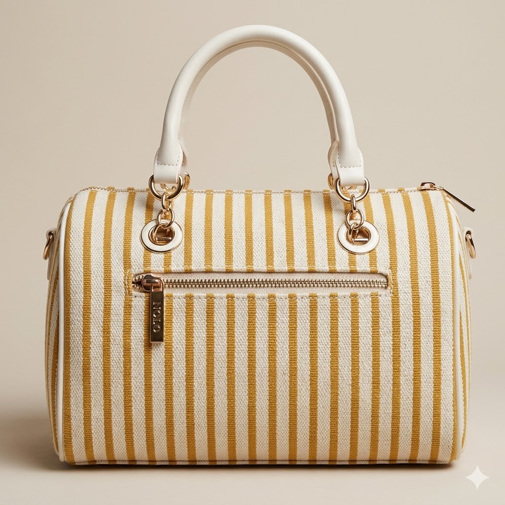 Bolso bowling de diseño actual con cuerpo cilíndrico de rayas verticales en amarillo mostaza y blanco, un contraste fresco y luminoso que aporta personalidad sin perder la elegancia. Incorpora una cadena dorada decorativa con iniciales metálicas y asas de piel en tono mostaza que garantizan comodidad y un acabado de calidad. Su estructura firme, los detalles dorados y el formato práctico lo convierten en un accesorio versátil, perfecto para elevar looks diarios con un toque chic y moderno.
