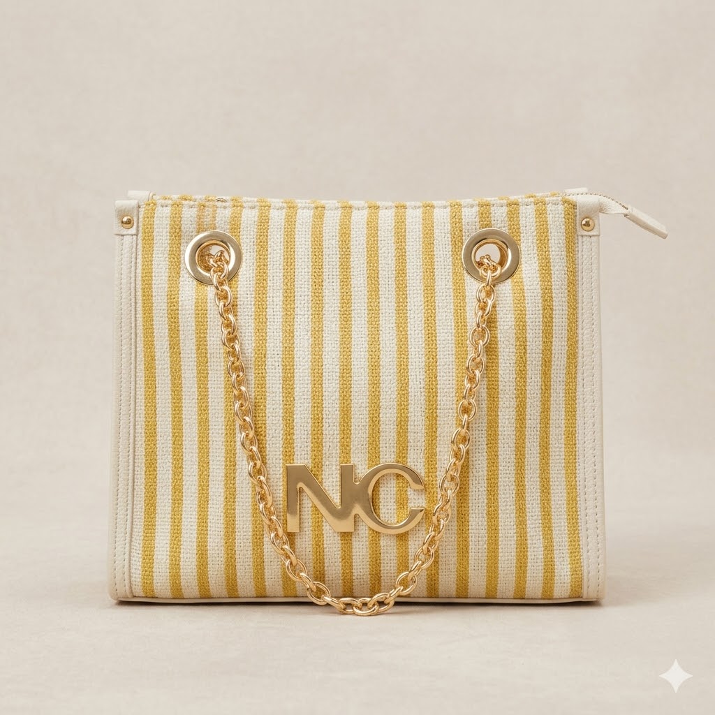 Fabricado en lona a rayas con textura y relieve, combina una base beige con rayas de color que aportan frescura y personalidad. Disponible en amarillo, rosa o azul, es perfecto para dar un toque veraniego a cualquier look.