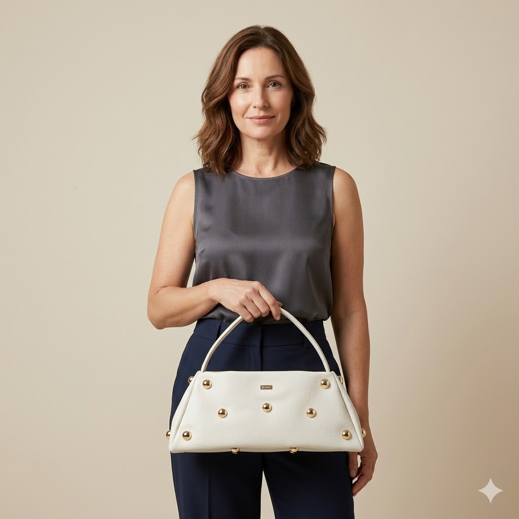 Este bolso blanco destaca por su diseño sofisticado y moderno, perfecto para elevar cualquier look. Fabricado en material texturizado de alta calidad, presenta una silueta trapezoidal estructurada que aporta estilo y firmeza. Su detalle más llamativo son las tachuelas doradas distribuidas de forma simétrica en el frontal y los laterales, creando un contraste lujoso y muy actual.