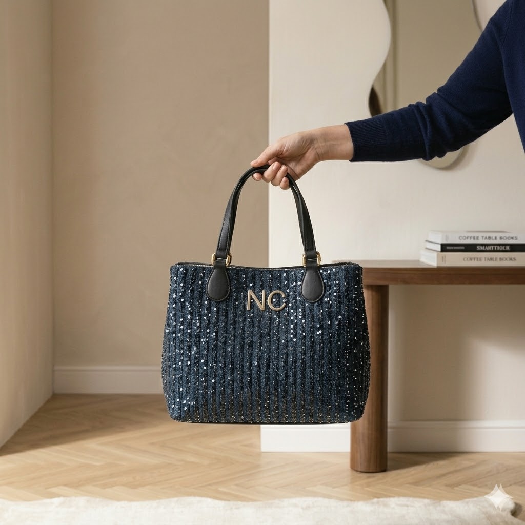 Bolso tote CARLA en formato cubito diseñado en tejido vaquero denim con incrustaciones cosidas de lentejuelas, un material sofisticado que combina el estilo urbano del denim con el brillo elegante de los detalles metalizados.