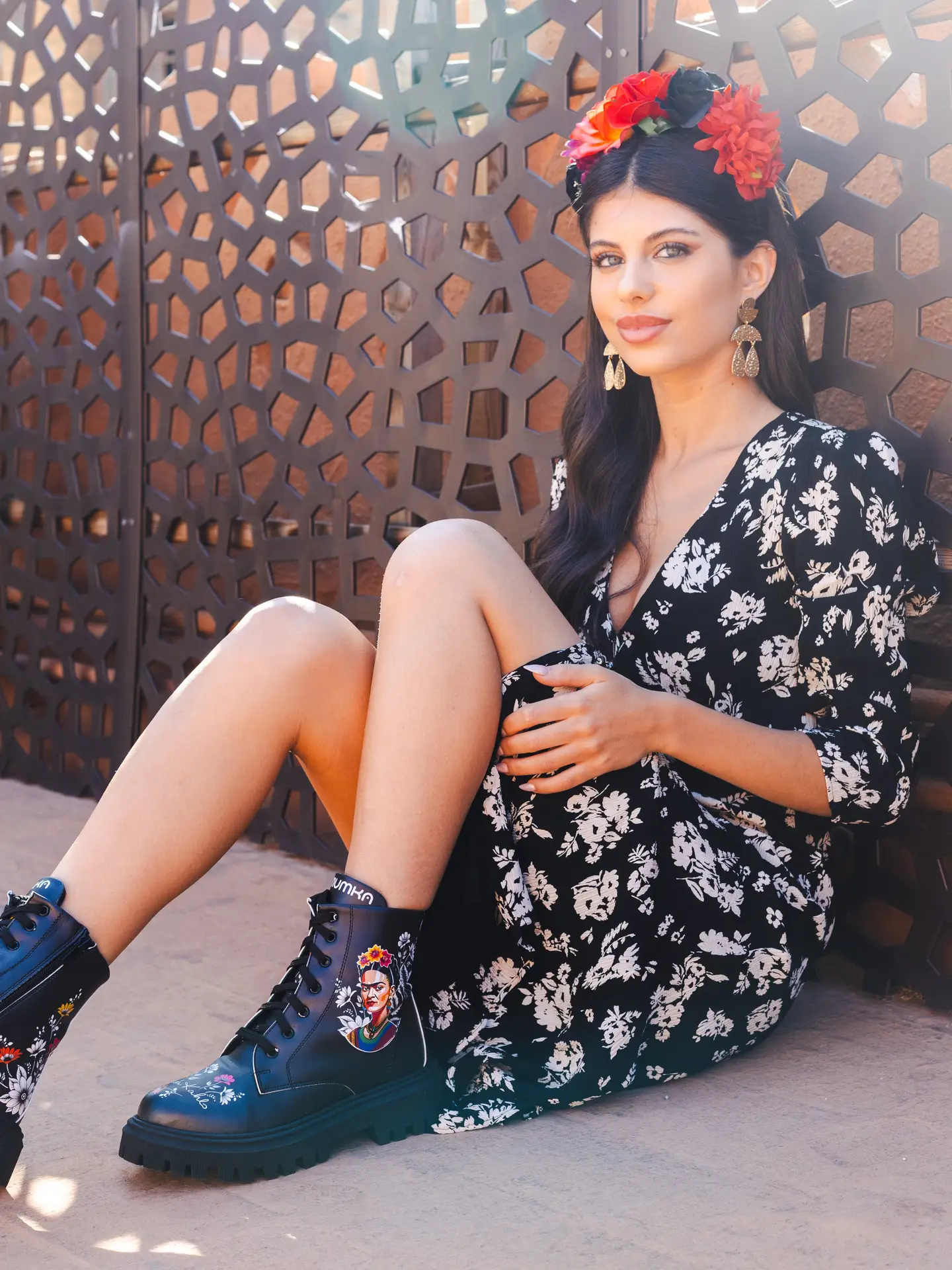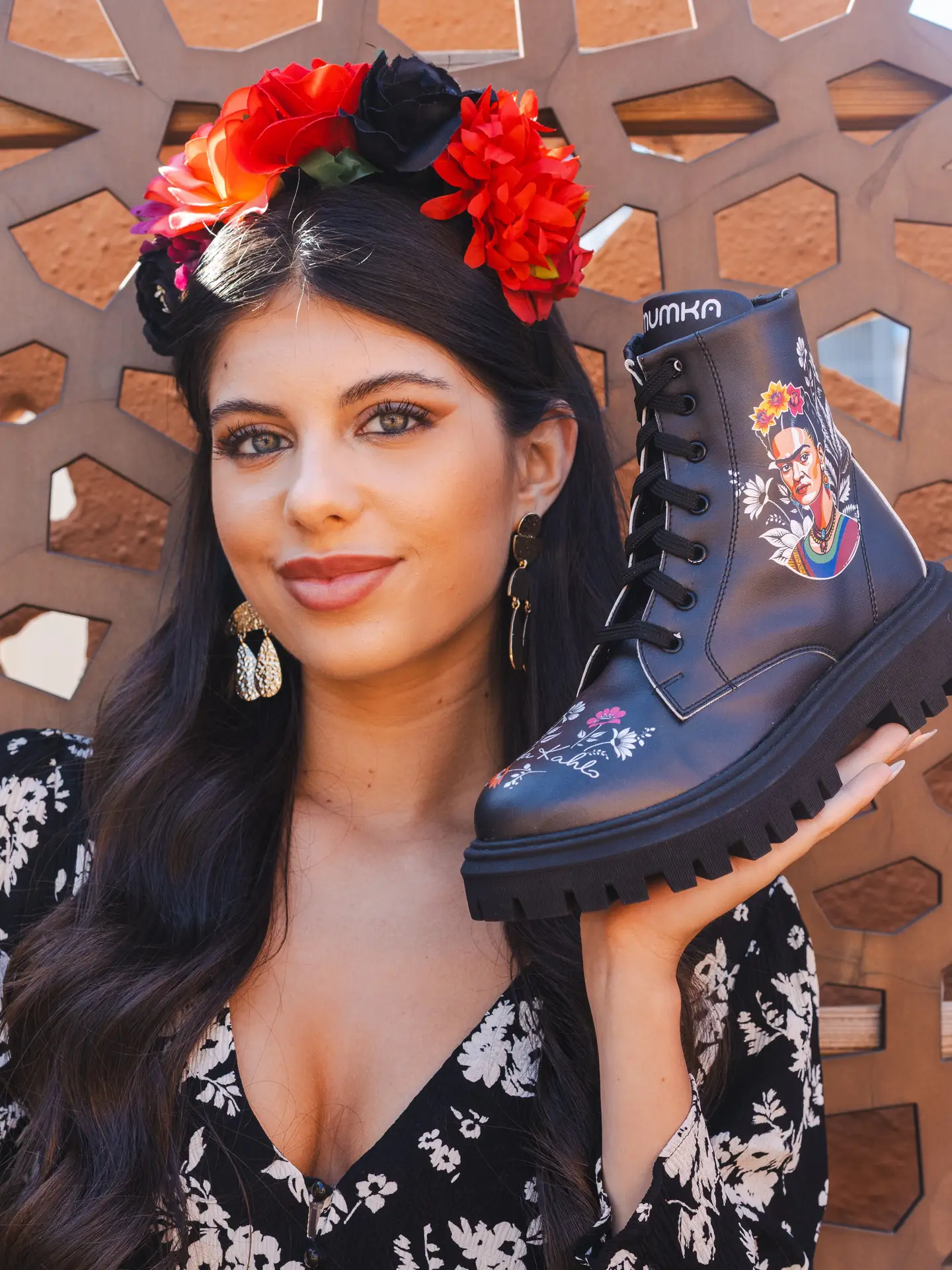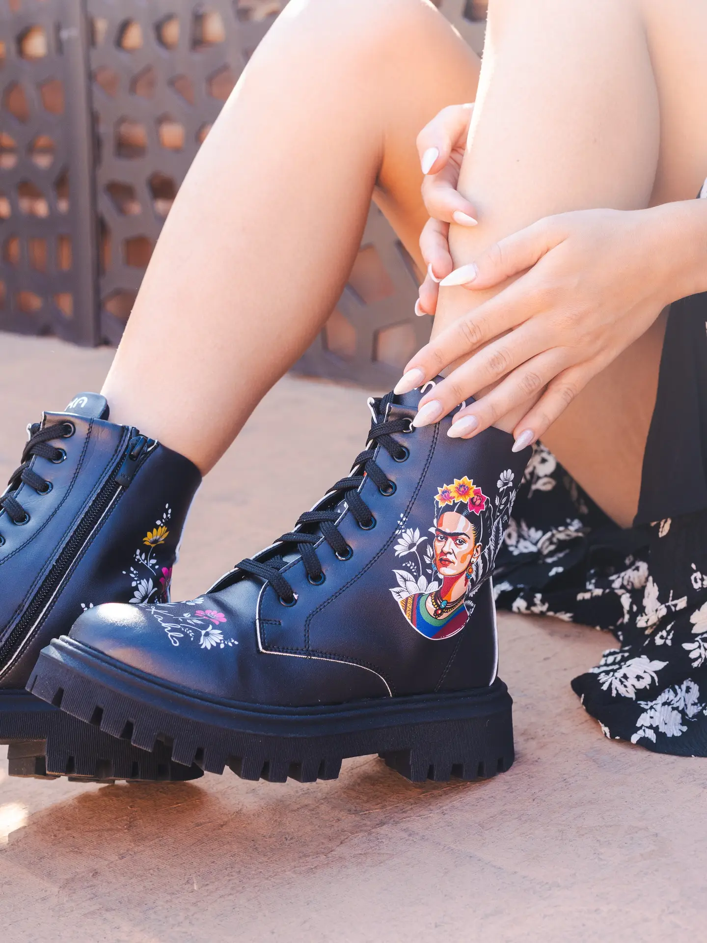 Botines negros de estilo urbano con un diseño artístico inspirado en la icónica Frida Kahlo. Cada pieza destaca por sus ilustraciones coloridas y detalladas, que combinan flores, hojas y elementos característicos del universo visual de la artista. Uno de los botines presenta un retrato vibrante de Frida, mientras que el otro incorpora motivos florales y su nombre en un elegante trazo decorativo.