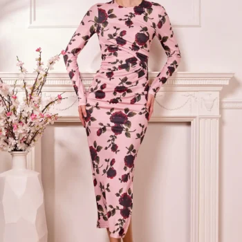 «Vestido midi rosa con estampado floral oscuro, manga larga y corte entallado. Diseño elegante y femenino de Paniculatta, ideal para eventos, celebraciones y momentos especiales.»